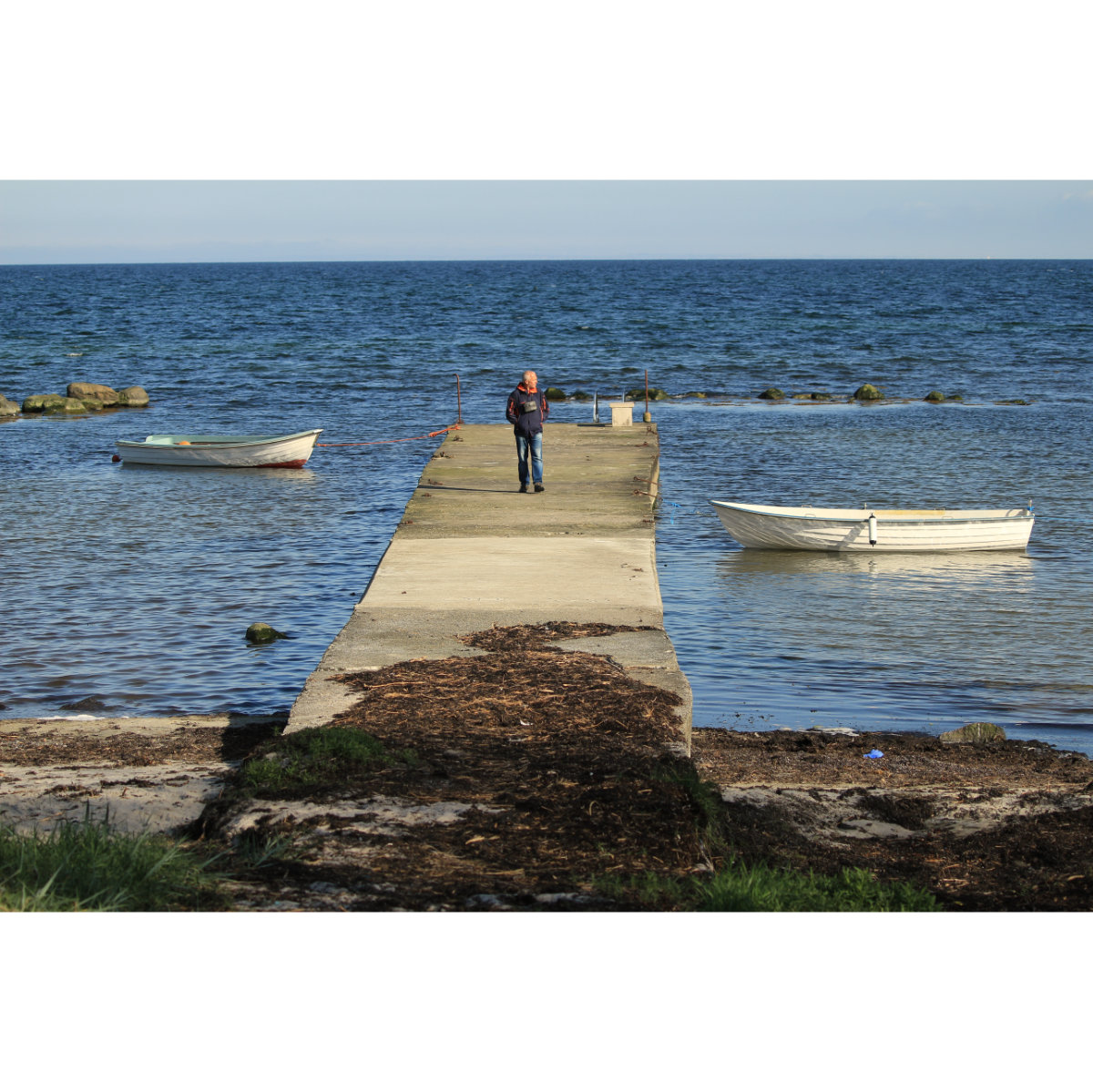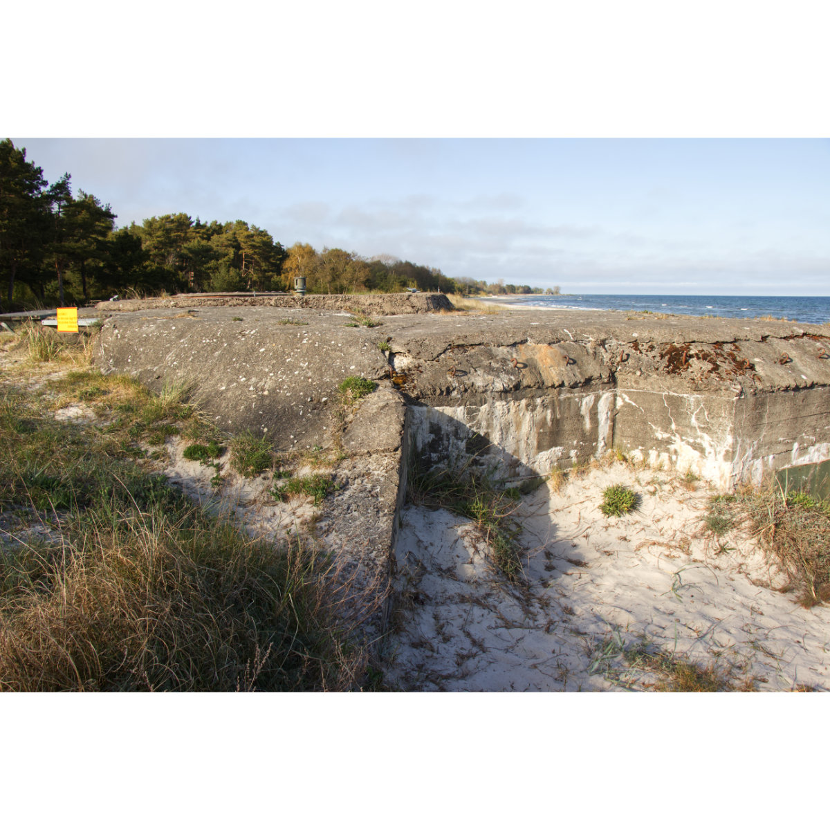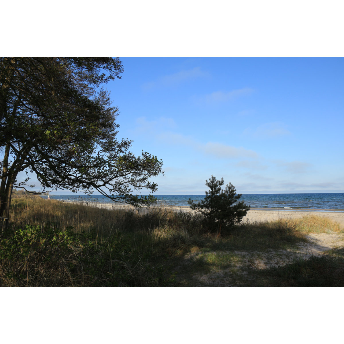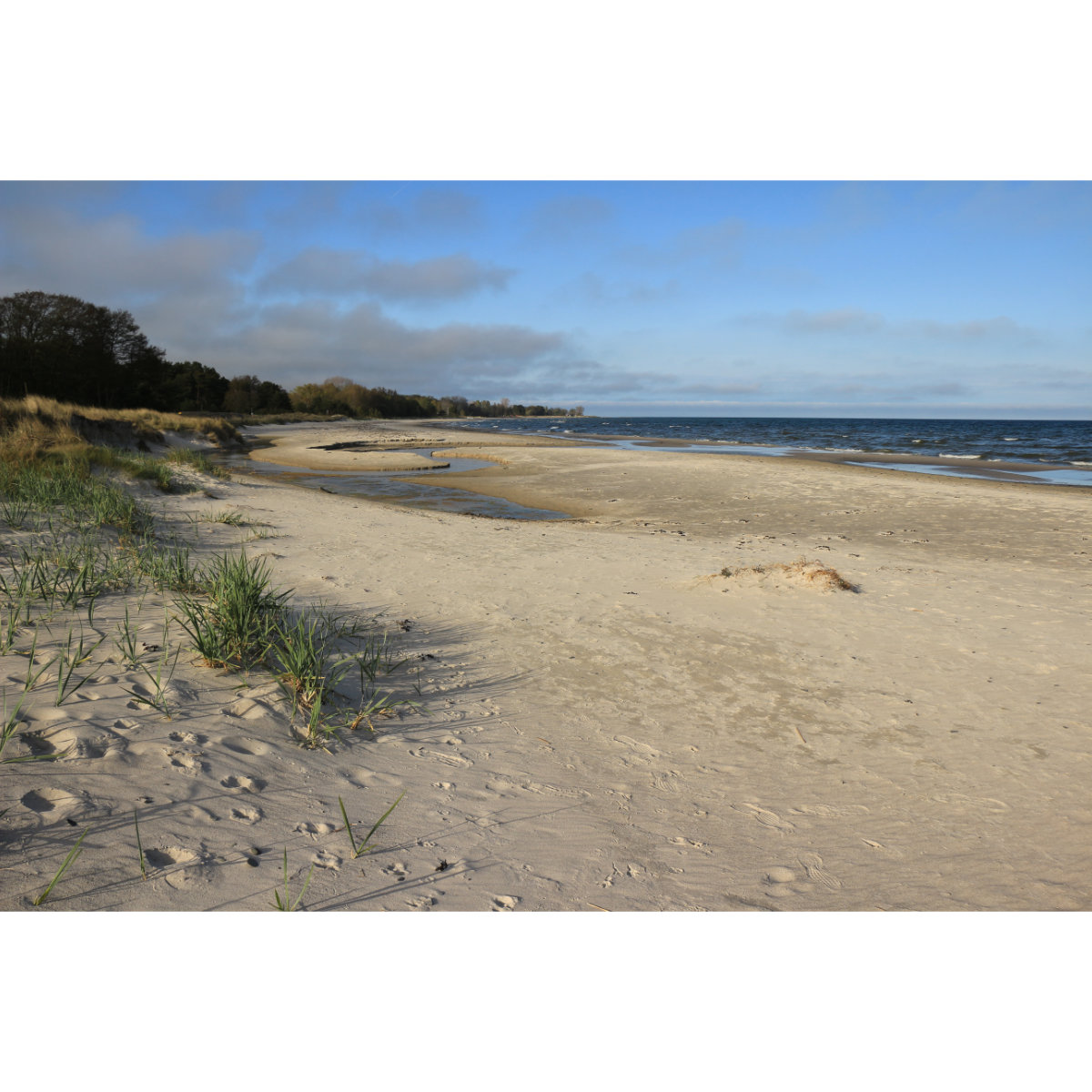 Am Strand von Borrby, an der Südküste von Schweden. Kilometerlanger Sandstrand, dahinter bewaldete Dünen in denen sich unzählige Ferienhäuser mehr oder weniger gut in die Landschaft einfügen.