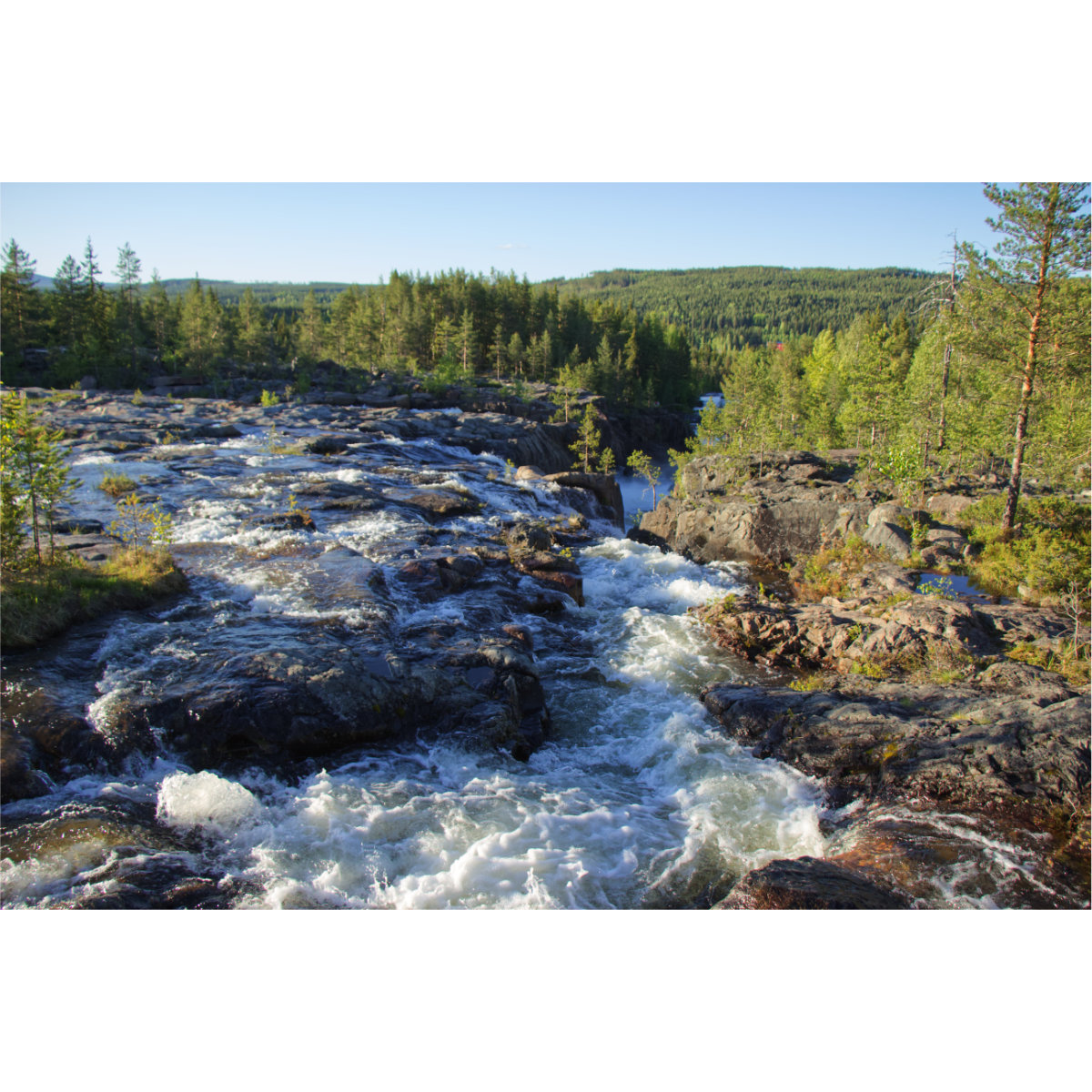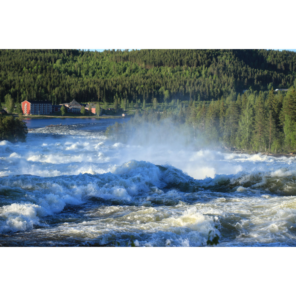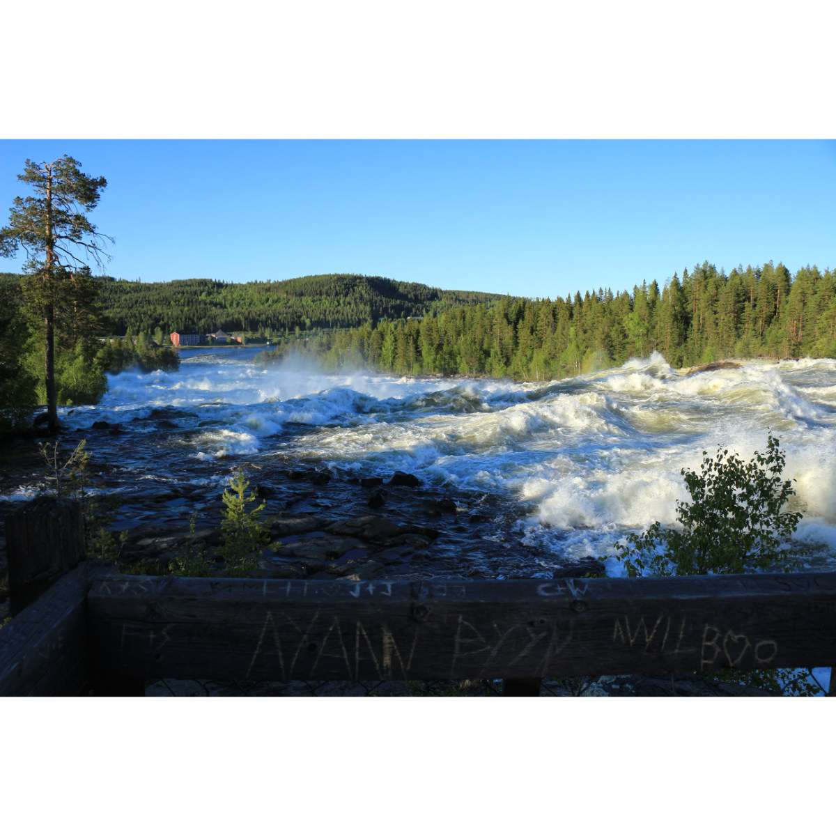 Storforsen Stromschnellen: Fallhöhe 60m, durchschnittlich 250 m³ Wasser pro Sekunde Gesamtlänge 5 km, Höhendifferenz 82m. Damit sind sie die größten Skandinaviens. Soweit die Fakten. Ein unglaubliches Erlebnis aber, diese tosenden, tanzenden, brodelnden Wassermassen zu Tal rauschen zu sehen und zu hören. Über die großen Felsen der seitlichen Bereiche und die Holzstege kann man ganz nah herangehen. Und abends nach zehn waren wir fast alleine, bei Tageslicht!
