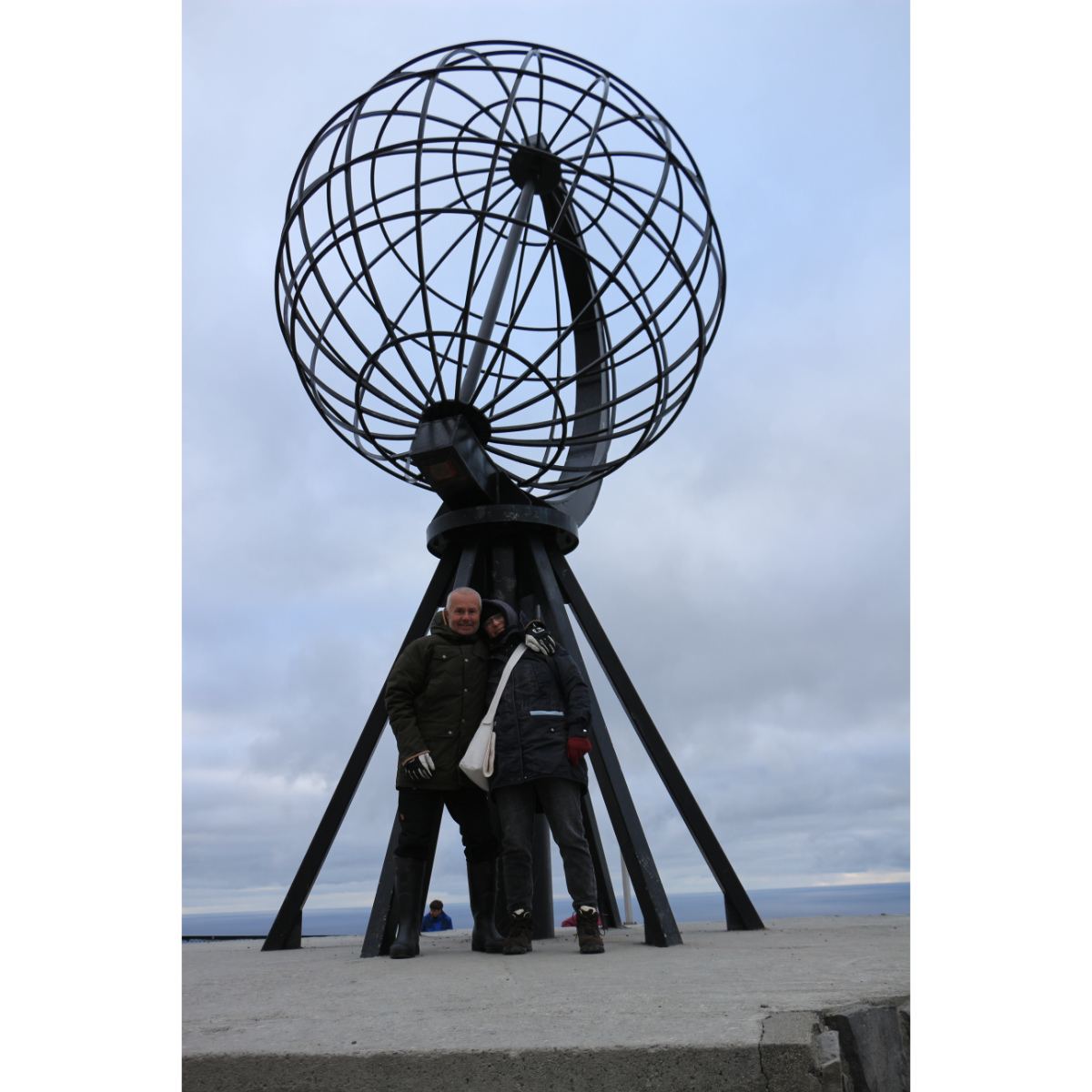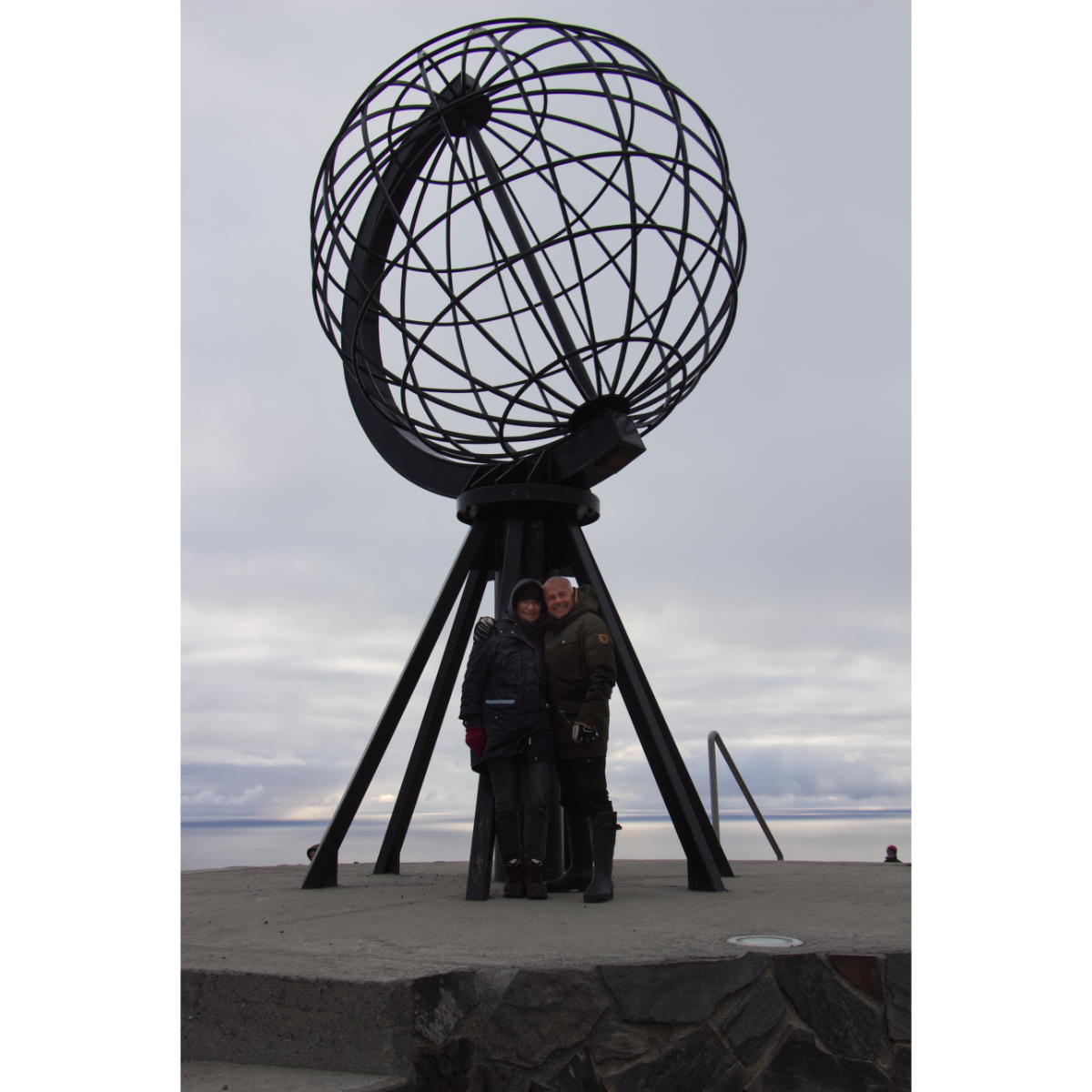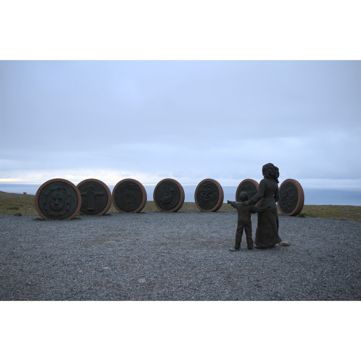 Wir sind angekommen am nördlichsten auf der Straße erreichbaren Punkt Europas! Es ist kalt, es weht ein stürmischer, eisiger Wind, aber es ist herrlich! Die ständig wechselnde Bewölkung, aufziehende Nebelschwaden, durchbrechende Sonnenstrahlen zaubern eine besondere Stimmung. Wir warten auf die Mitternachtssonne, doch in dieser Nacht zeigt sie sich nur für Augenblicke. Das Denkmal der Kinder der Welt soll Freundschaft, Zusammenarbeit, Hoffnung und Freude, über alle Grenzen hinweg darstellen.