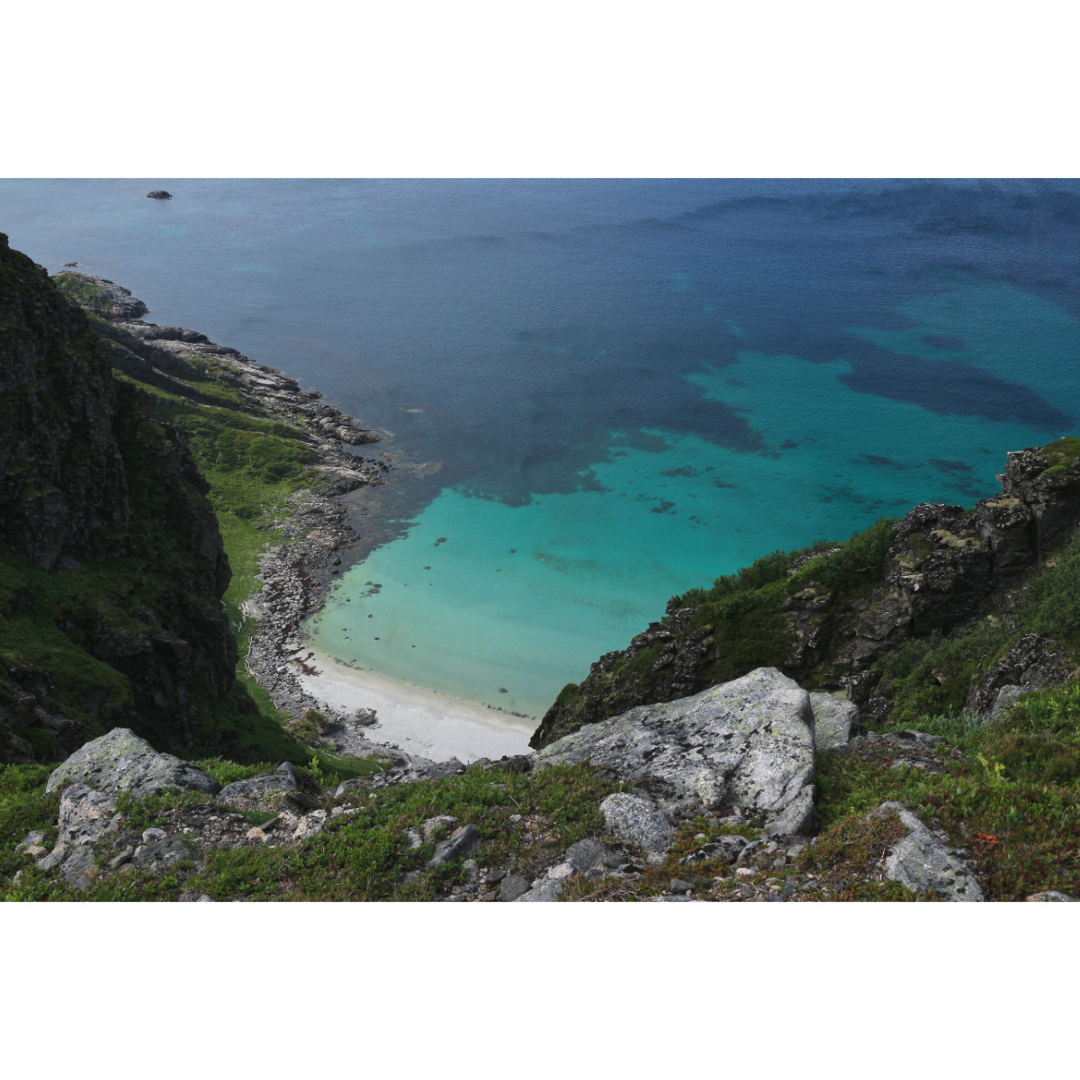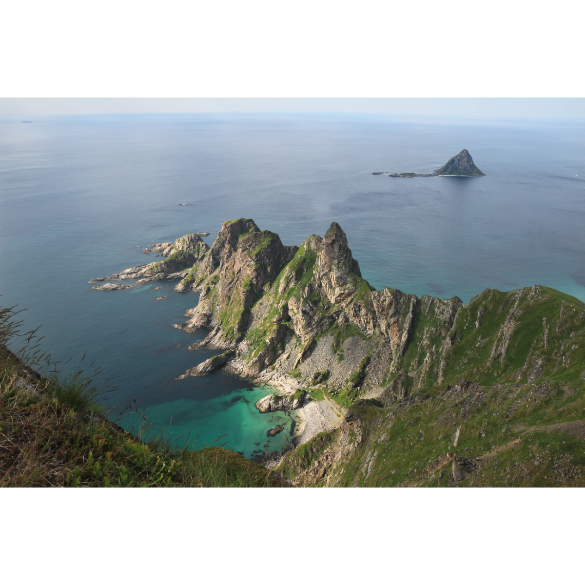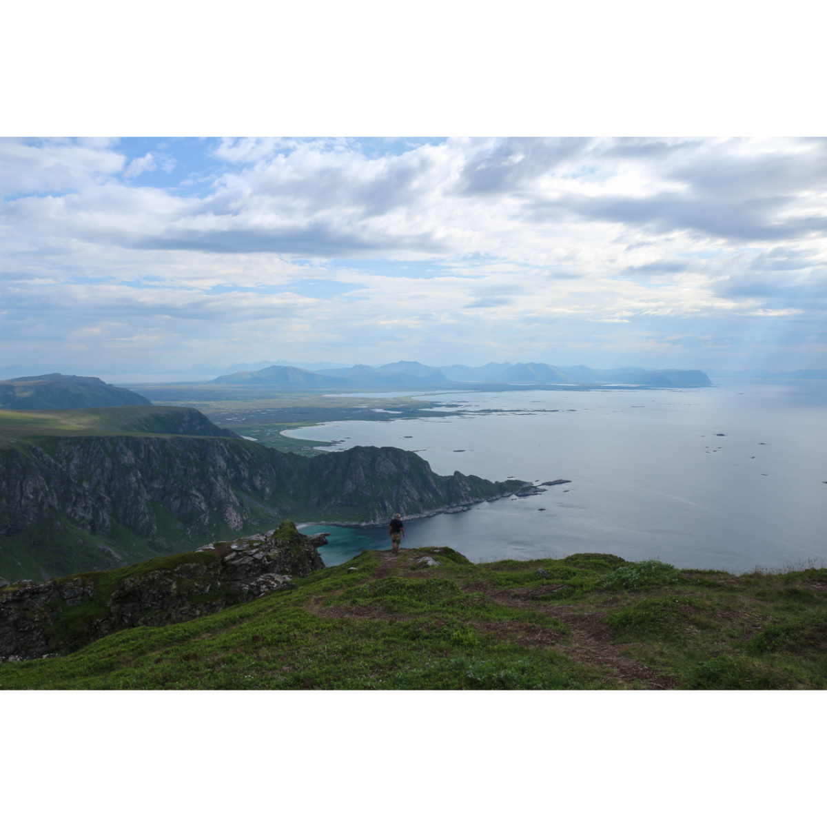 Bergtour auf den Måtind. Jawohl, Bergtour, auch wenn der Berg nur 408m hoch ist, so geht es zum einen ab Meereshöhe los, zum anderen ist der Aufstieg, den wir gewählt haben seeehr steil, der Pfad seeehr schmal, man musste immer wieder an ausgesetzten Stellen klettern und mehrmals war ich versucht umzudrehen, wenn der Abstieg mich nicht noch mehr geschreckt hätte. Oben angekommen war das dann aber schnell vergessen, die Aussicht auf die Bucht und den Vogelfelsen ist einfach umwerfend. Für den Abstieg wählten wir den Weg zur Bucht, zwar auch steil aber machbar.