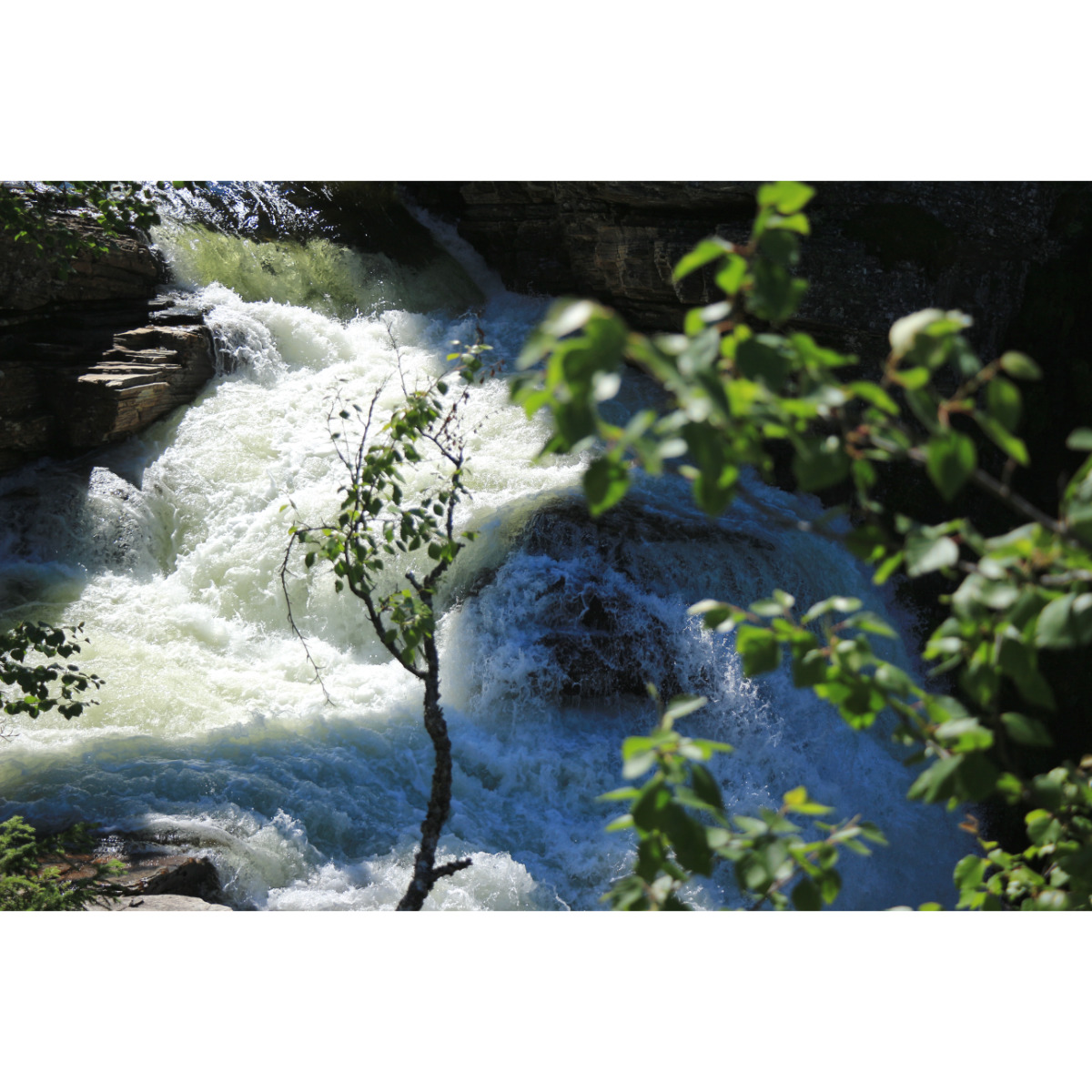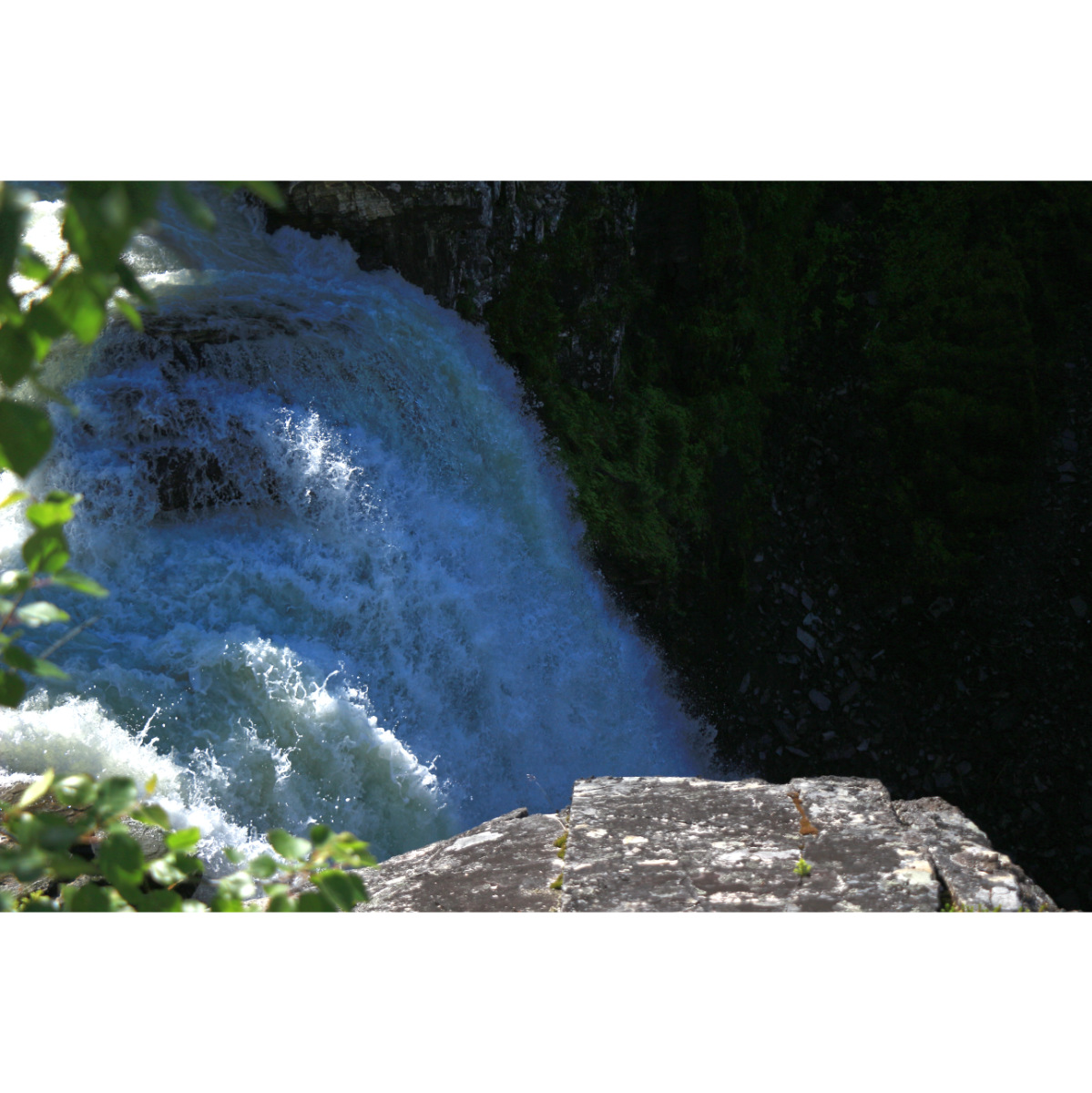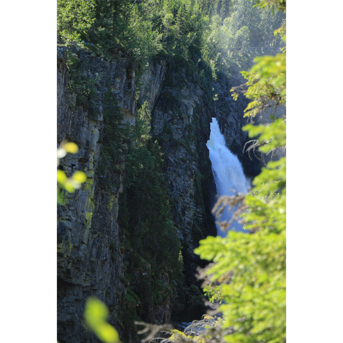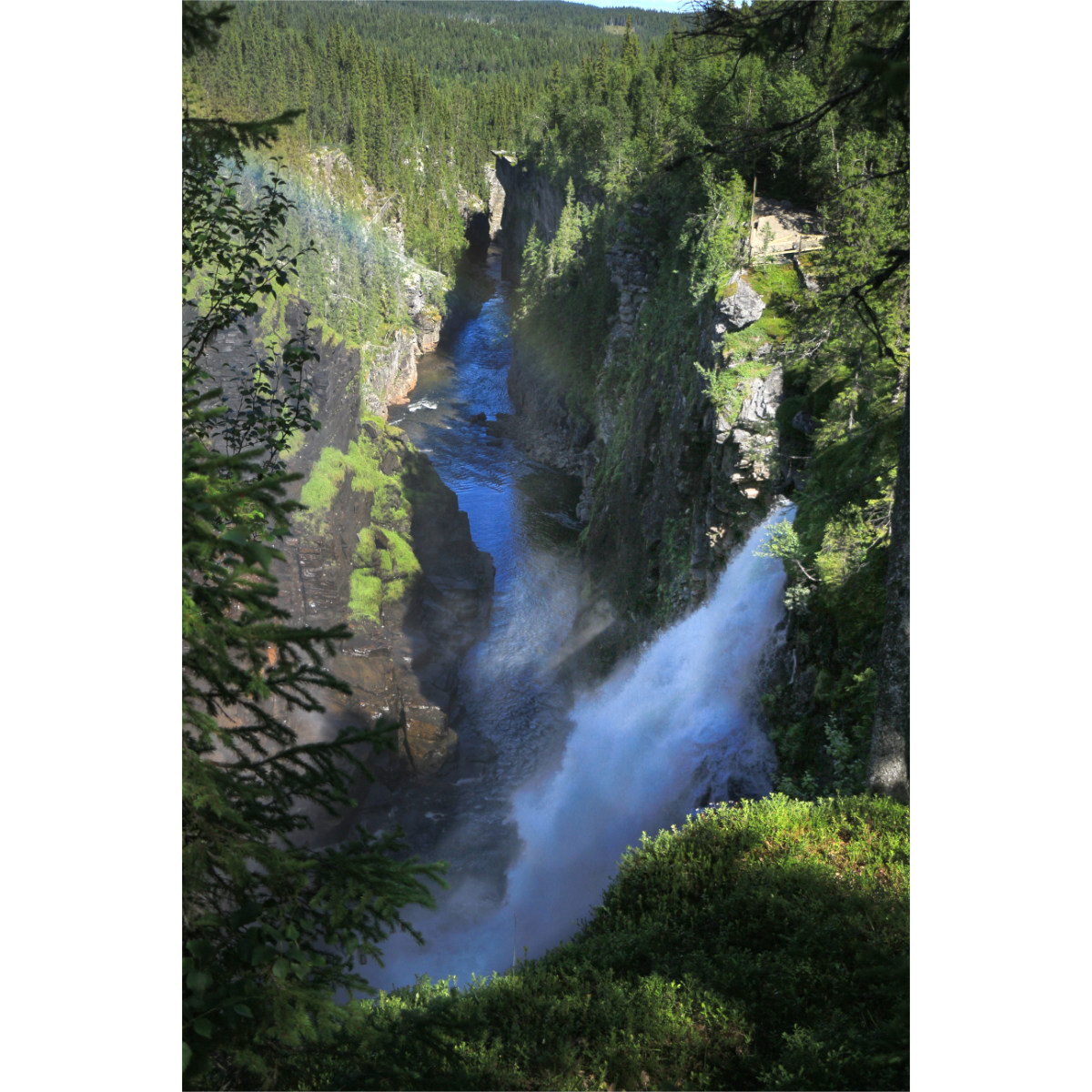 Eine kurze aber schöne Wanderung zum Wasserfall Hällingsåfallet. Es geht zunächst am Fluss Lilla Hällingsån entlang auf Trampelpfaden durch den Wald, irgendwann beginnt die Schlucht. Dann erhascht man den ersten Blick auf den Wasserfall. Der Fluss stürzt 43 Meter die Bergwand hinunter und wirbelt dann durch diesen 800 Meter langen und 15-60 Meter breiten Canyon. Leider ist die Aussichtsplattform, von der aus man die beste Sicht auf den Wasserfall hat wegen Abbruchgefahr gesperrt. Bei Sonnenschein bildet sich ein Regenbogen, manchmal auch ein doppelter. Der Sonnenschein heute hat nur für einen Regenbogen gereicht, aber wir haben sowohl die Sonne als auch den einfachen Regenbogen genossen.