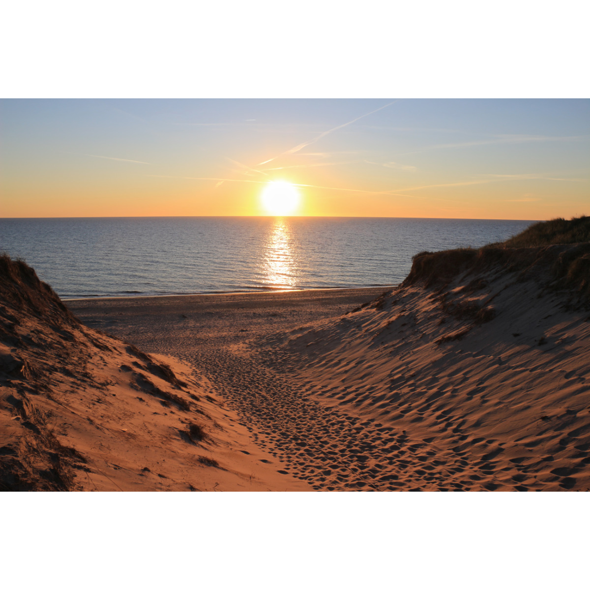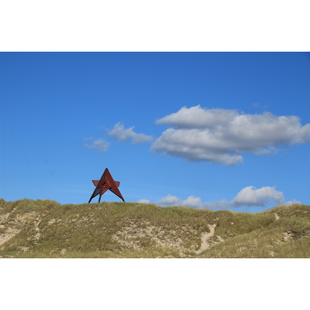 Am Strand von Vedersø Klit, einer Ferienhaussiedlung an der dänischen Nordsee. Für die Ferienhäuser sind Mauerwerk und Reetdächer vorgeschrieben, so dass ein ursprünglicher Gesamteindruck entsteht. Das hölzerne Seezeichen wurde 1884 aufgestellt. Es gibt noch 11 weitere an der Küste, alle unterschiedlich, um von See unterscheidbar zu sein.