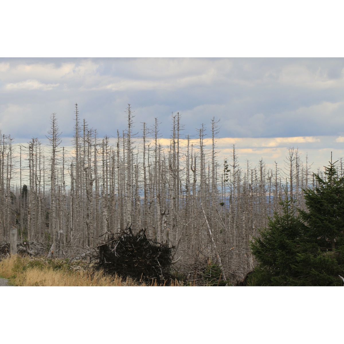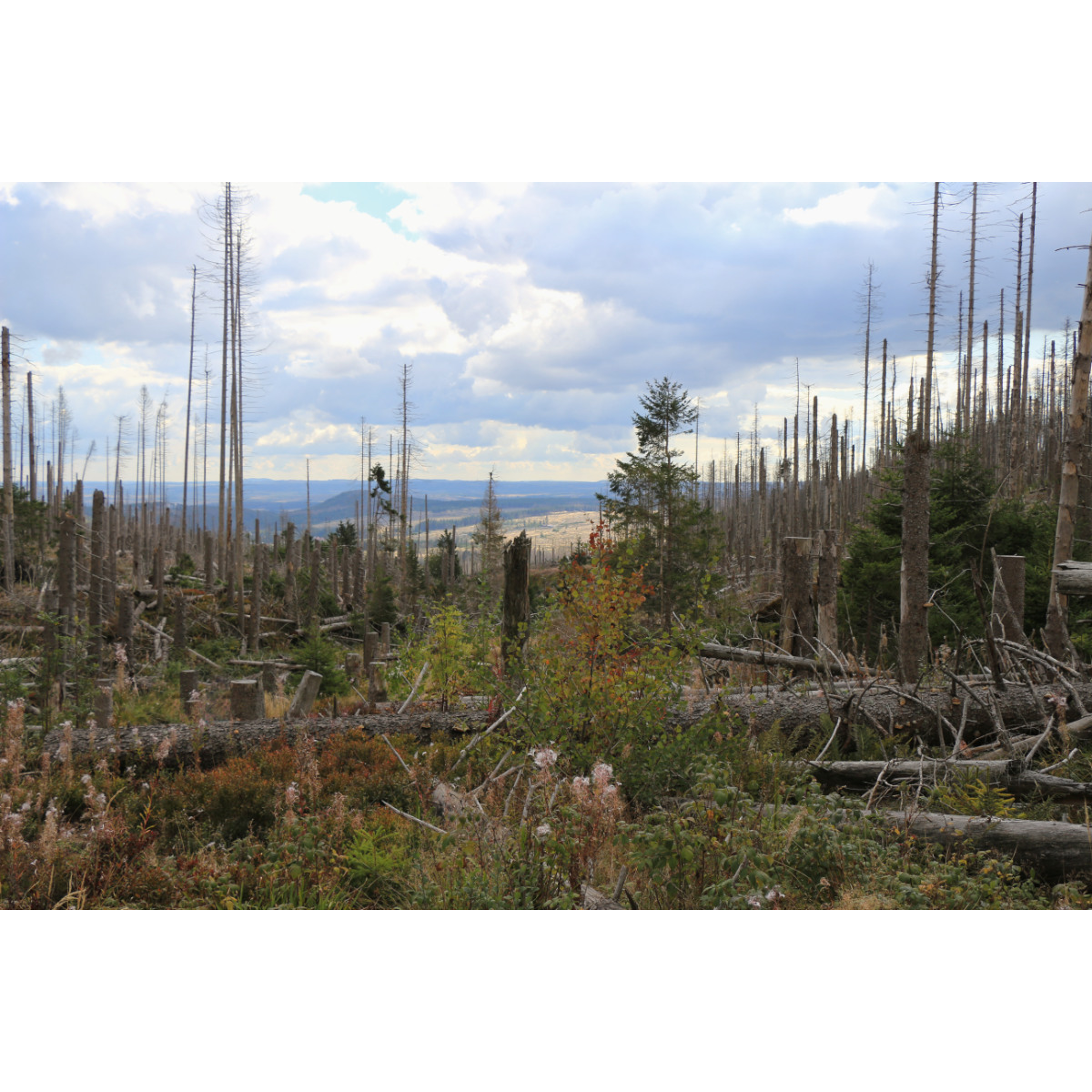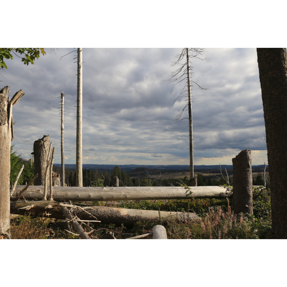Fährt man in den Harz sieht man, was Waldsterben bedeutet und welche Auswirkungen Klimaveränderung hat. Riesige Flächen ehemaliger Fichtenwälder sind heute zu Gebeinen gebleichte Mahnmale der Natur. Wälder in Monokultur mit nicht geeigneten Baumarten haben mehrjähriger Trockenheit nichts entgegenzusetzen und sind damit dem Borkenkäfer ausgeliefert. Wir sind auf den 1141m hohen Brocken gewandert. Von Schierke aus sind wir durch das Eckerloch aufgestiegen, über Felsblöcke, Baumwurzeln und Bohlenwege, haben die Brockenbahn hinauf schnaufen sehen und die unterschiedlichen Stadien von Baumsterben und Neubewuchs in Augenschein nehmen können. Die abgestorbenen Fichten zeigen sich zunächst noch mit grünem Wipfel, dann wird der ganze Baum trocken und braun. Wenn Rinde und Äste abgefallen sind bleichen die verbliebenen Stangen in der Sonne aus wie Skelette. Ein erschreckender Anblick. Dort, wo naturnaher Bewuchs ist, ist üppiges Grün. In den Zonen, die heute der Natur überlassen sind wächst auf und über Totholz neuer Wald. Gepflanzte Laubbäume sollen verhindern, dass die schnellwachsende Fichte erneut das Terrain für sich einnimmt. Es wird noch lange brauchen, bis der neue Wald die Fehler der Vergangenheit überwachsen hat …
