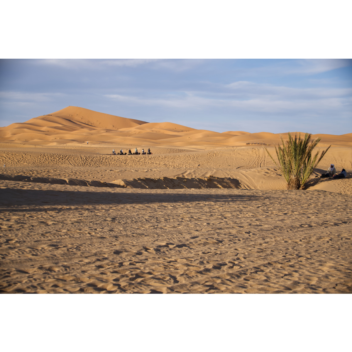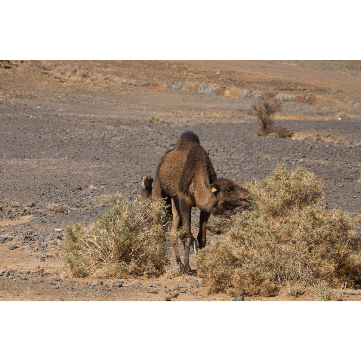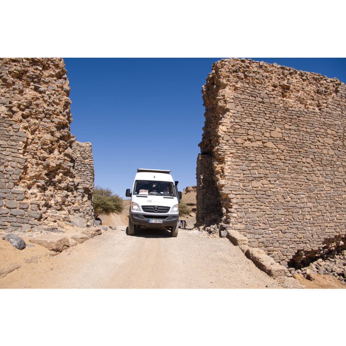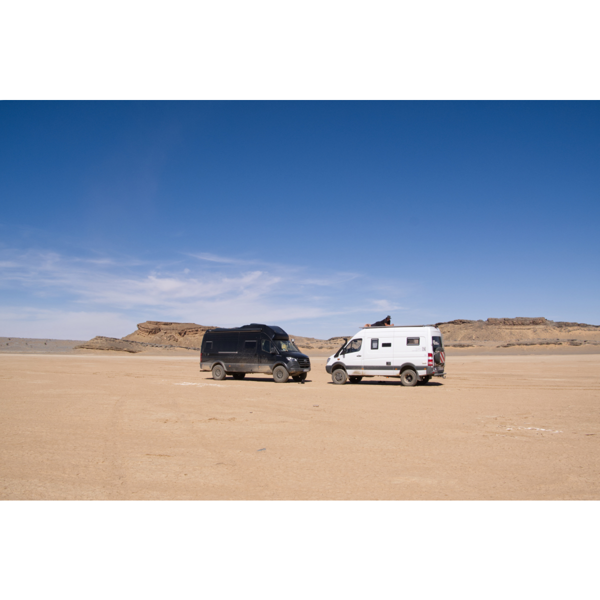 Ungeplantes Iglhaut-Sprinter-Treffen an lauschigem Plätzchen neben unserer Route nach Merzouga. Stopp an der Gara Medouar, einer hufeisenförmigen Felsformation. Im 11. Jh. zu einer Festung ausgebaut diente sie auch schon als Kulisse für Filme, z.B. im Bond-Film Spectre. Im Inneren kann man eine Rampe hinauffahren, die Aussicht von oben ist fantastisch. Das kleine Dromedar hat mit mir Verstecken gespielt, hat mich hin und her gescheucht, es wollte sich einfach nicht fotografieren lassen. Abends erreichten wir die Erg Chebbi und unseren Stellplatz bei der Kasbah Mohayut bei Merzouga - sehr schöne Kasbah und gutes Essen.