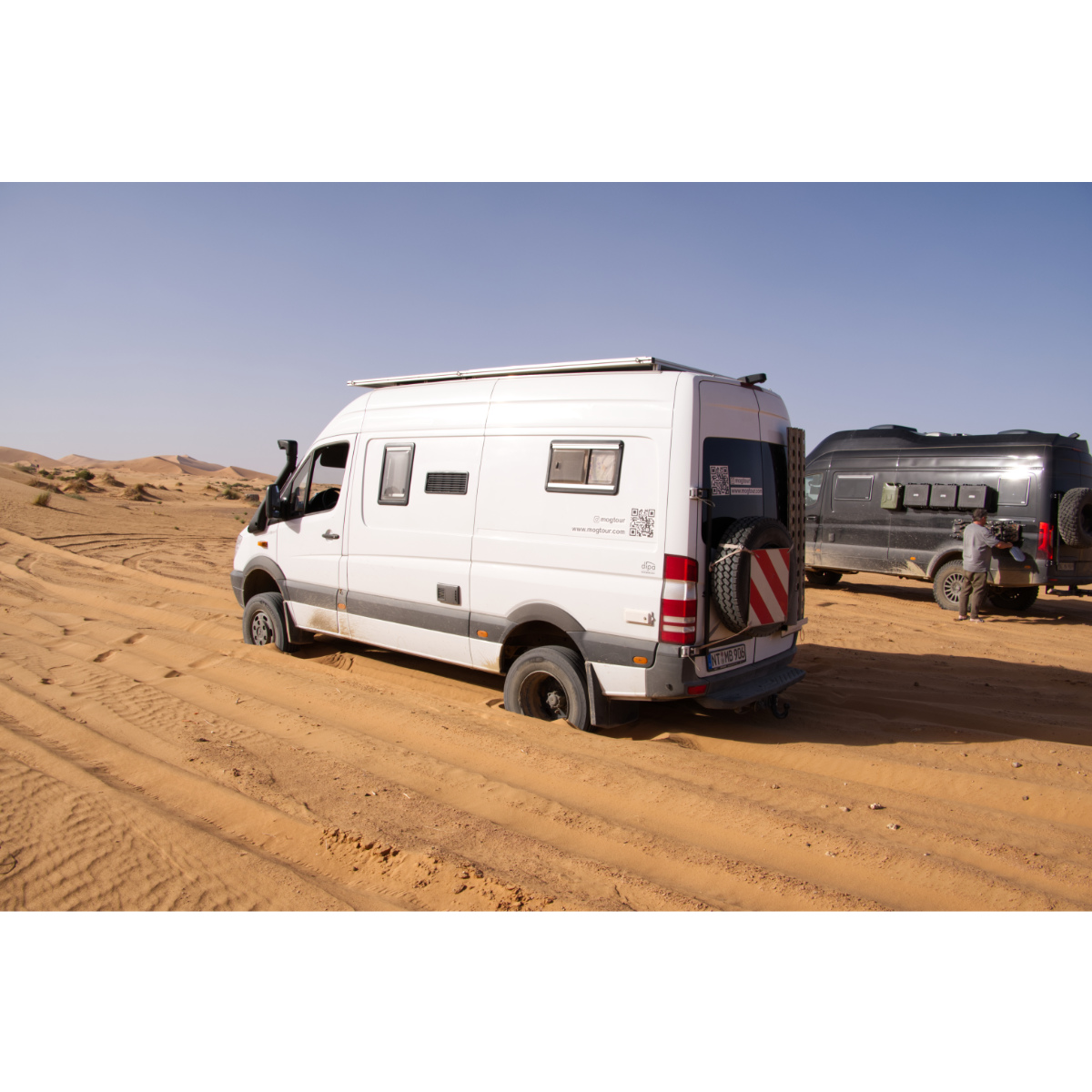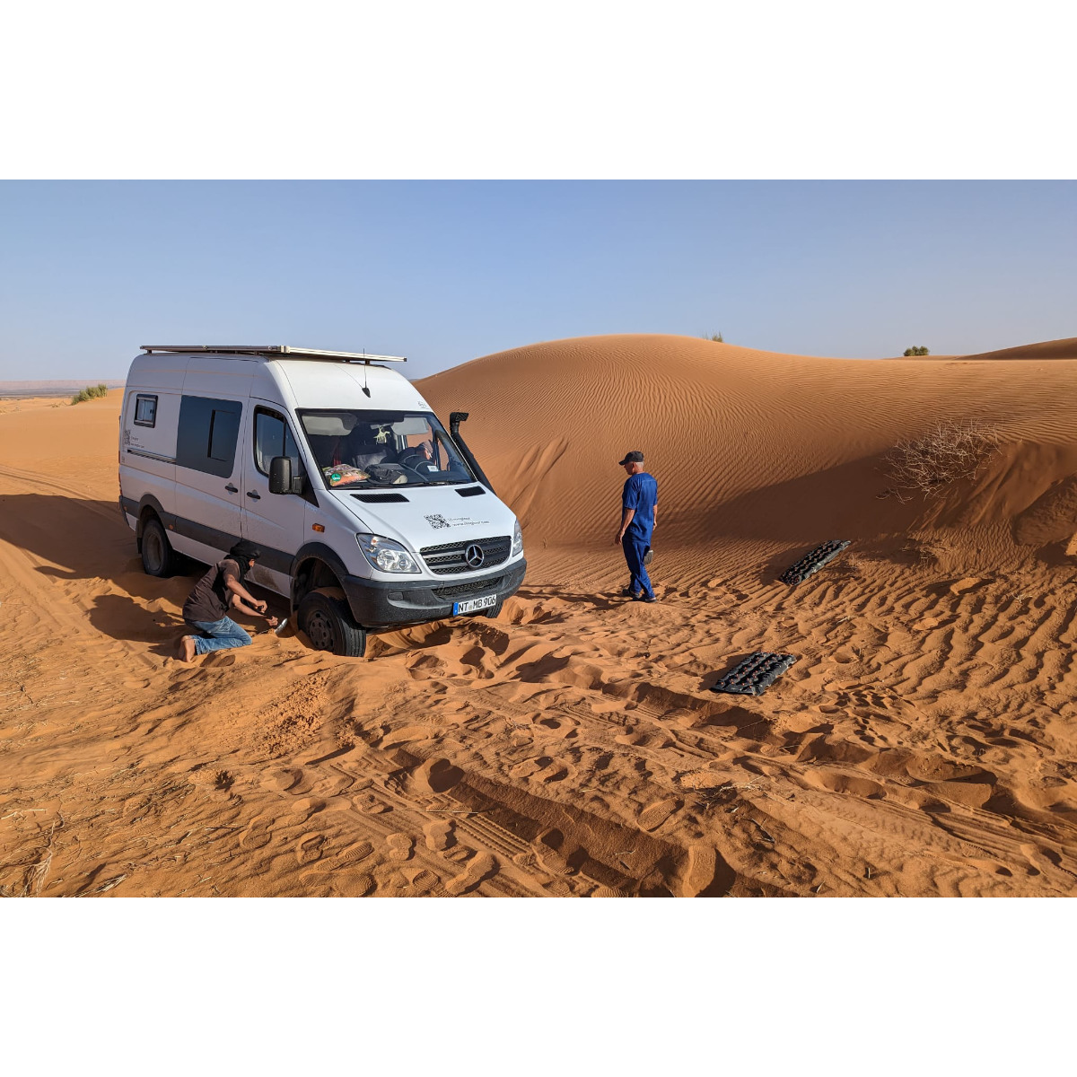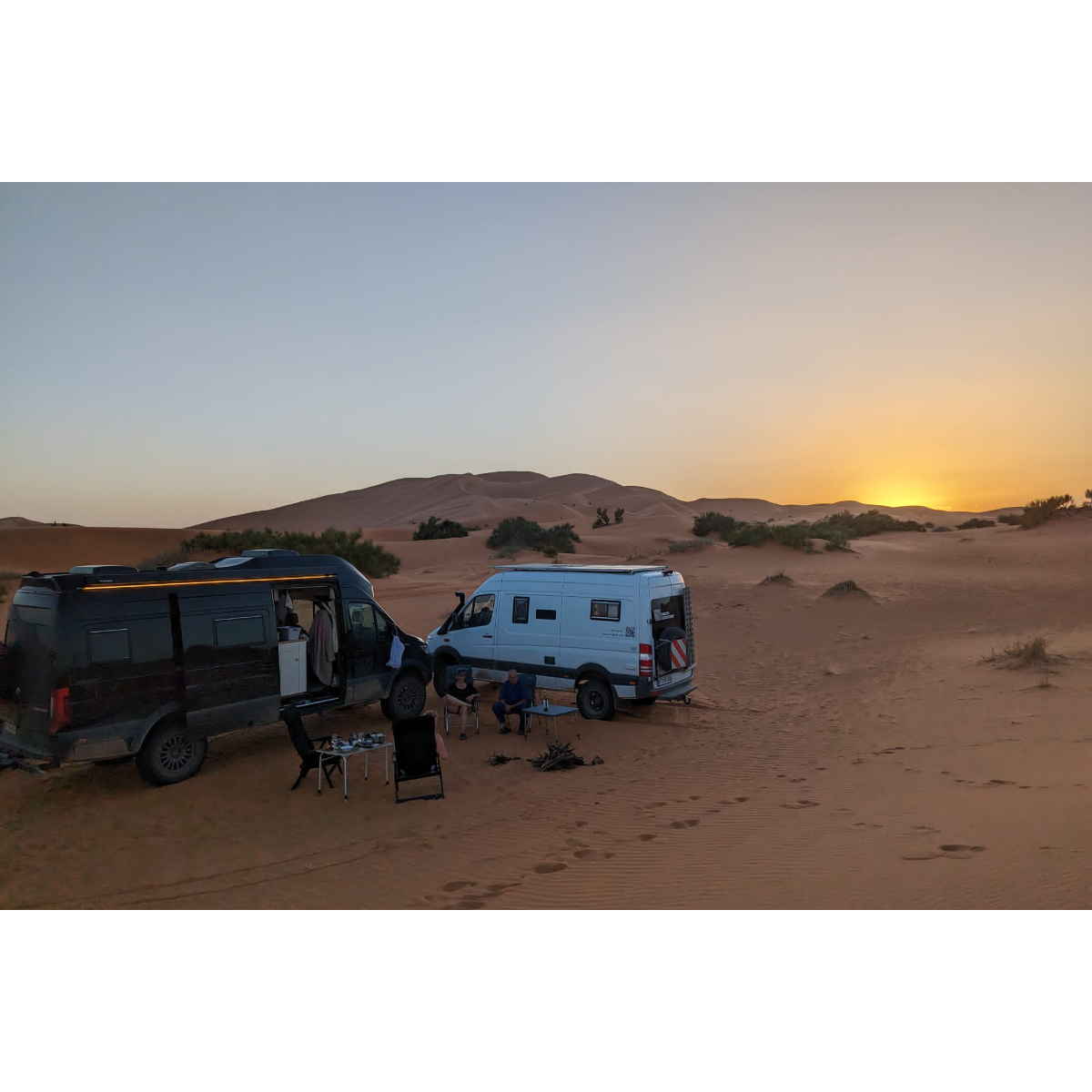 Das Erg Chebbi, ein Wüstengebiet, das zur Sahara gehört, ist ca. 22km lang und bis zu 5km breit. Es ist touristisch stark erschlossen, in Merzouga gibt es viele Unterkünfte, Camps, Anbieter von Touren mit Kamelen oder mit Dünenbuggies, die schon bei Sonnenaufgang für ordentlich Lärm sorgen. Unsere erste Wüstenfahrt rund um das Erg war abenteuerlicher als gedacht: 1. mal eingegraben - ausgegraben - 2. mal richtig tief eingegraben, mit fachmännischer Hilfe wieder flott gekriegt. Trotzdem ein schöner Abend in der Wüste mit Sonnenuntergang, Lagerfeuer und gutem Essen!