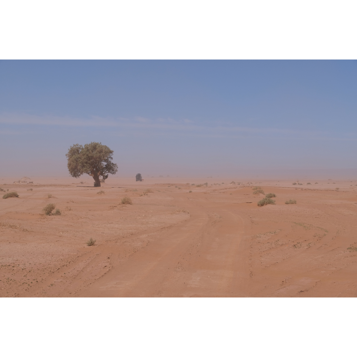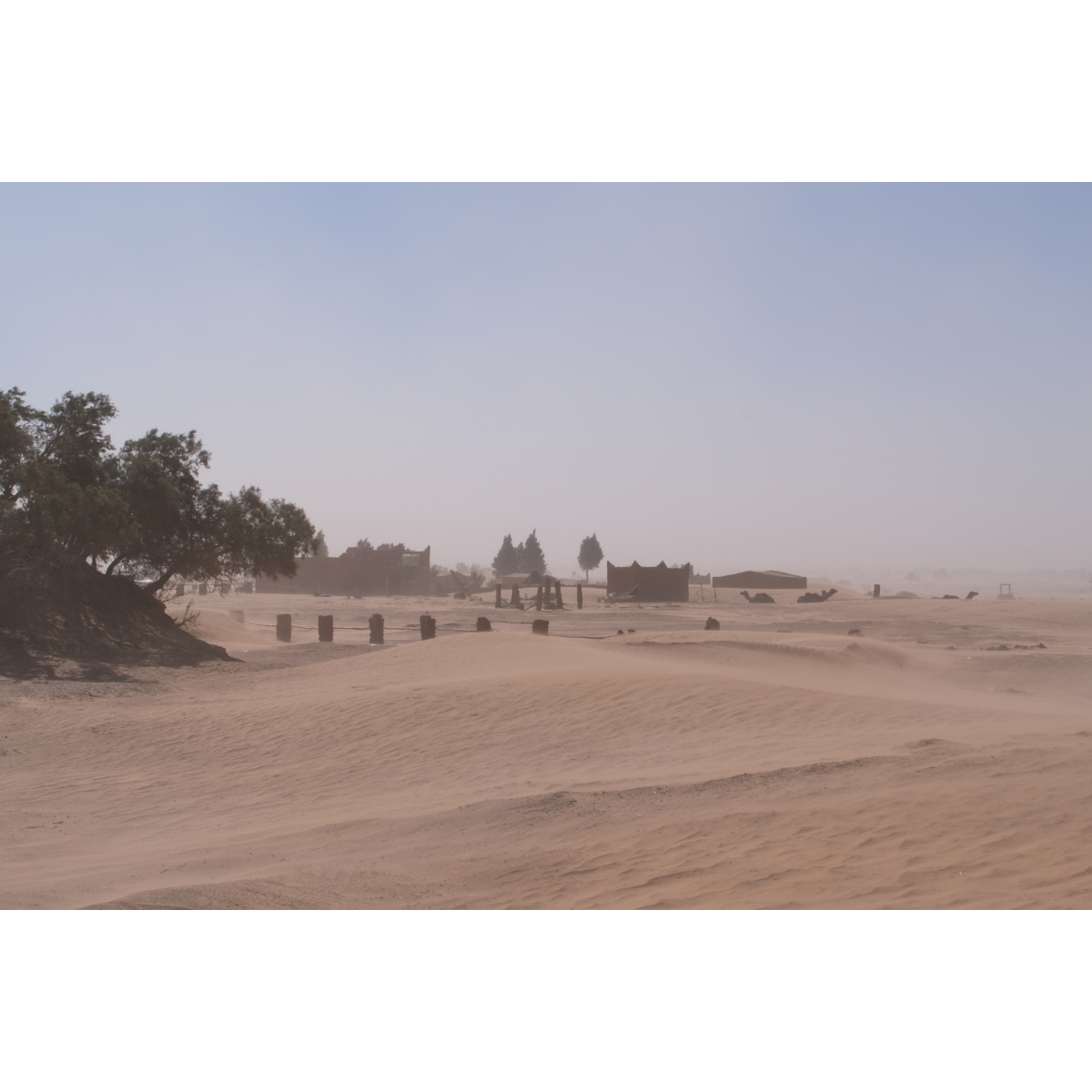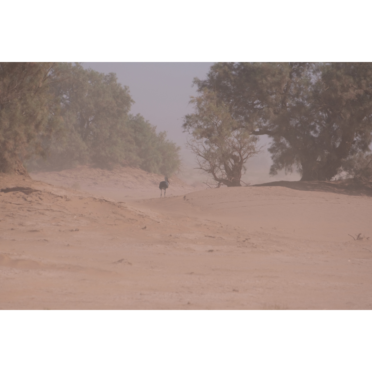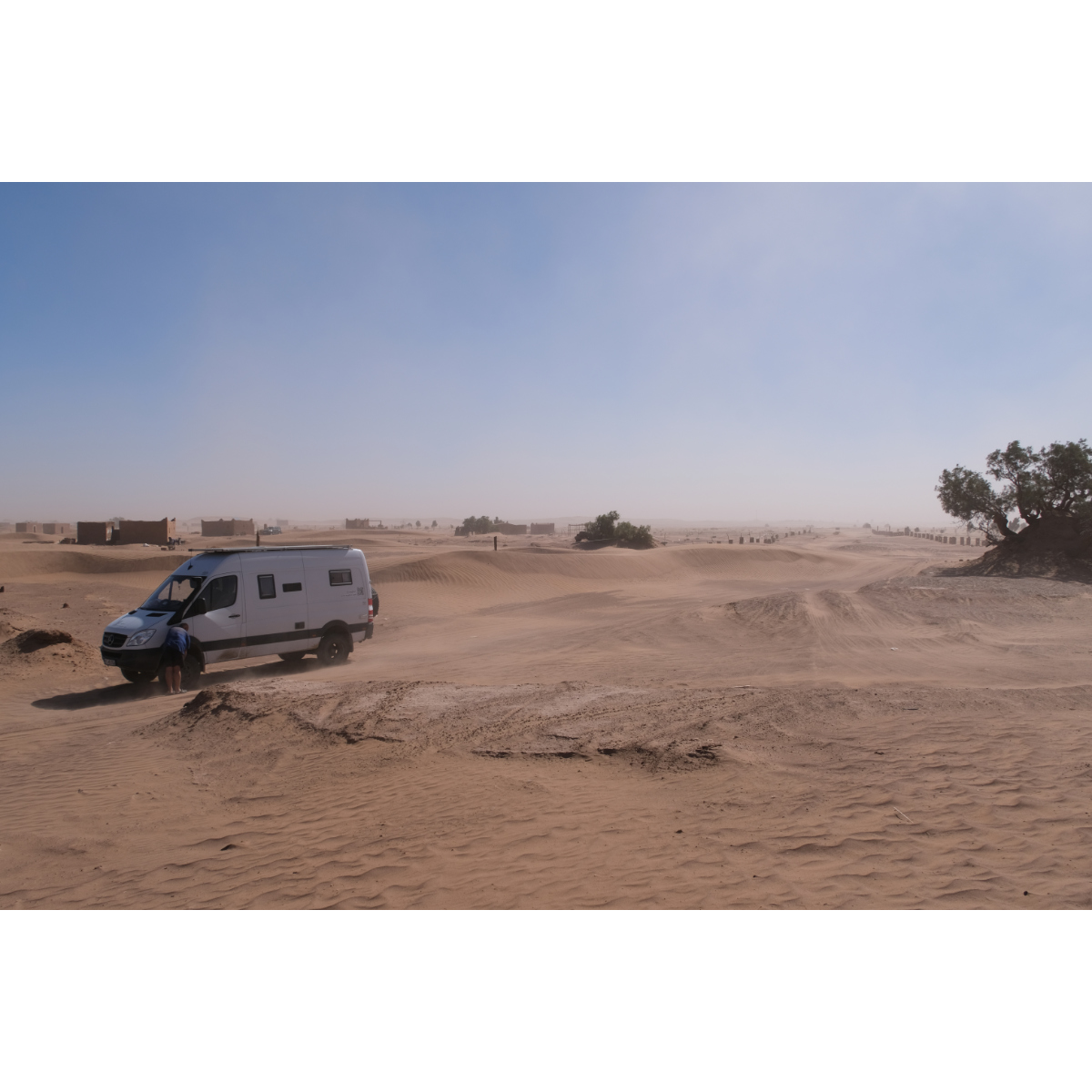 Teil I) Erg Chegaga, mit 150qkm die größte Sandwüste Marokkos. Die Chegaga ist wesentlich weniger frequentiert als die Chebbi, die Anfahrt ist länger und das letzte Drittel unangenehme Wellblechpiste. Mit viel Wind und meist wenig Sicht ging’s los, das Reifendruck ablassen war kein Spaß, sogar der Storch ließ sich zum Schutz vor dem Sand hinter einem Gestrüpp nieder. Gegen Mittag ließ der Wind nach. Wir verließen unsere eigentliche Route und nahmen Kurs auf die heilige Oase Oum Lâalag. Heute ist sie ziemlich verlassen, ein „Investor“ hat sie ringsum mit einer Mauer versehen und sie bröselt so vor sich hin - sehr schade! Davor saß eine Frau im Schatten, bastelte Kamele für die Touris und verkaufte warme Softdrinks in Dosen. Wir wandten uns wieder den Dünen zu, zurück auf unsere Route …