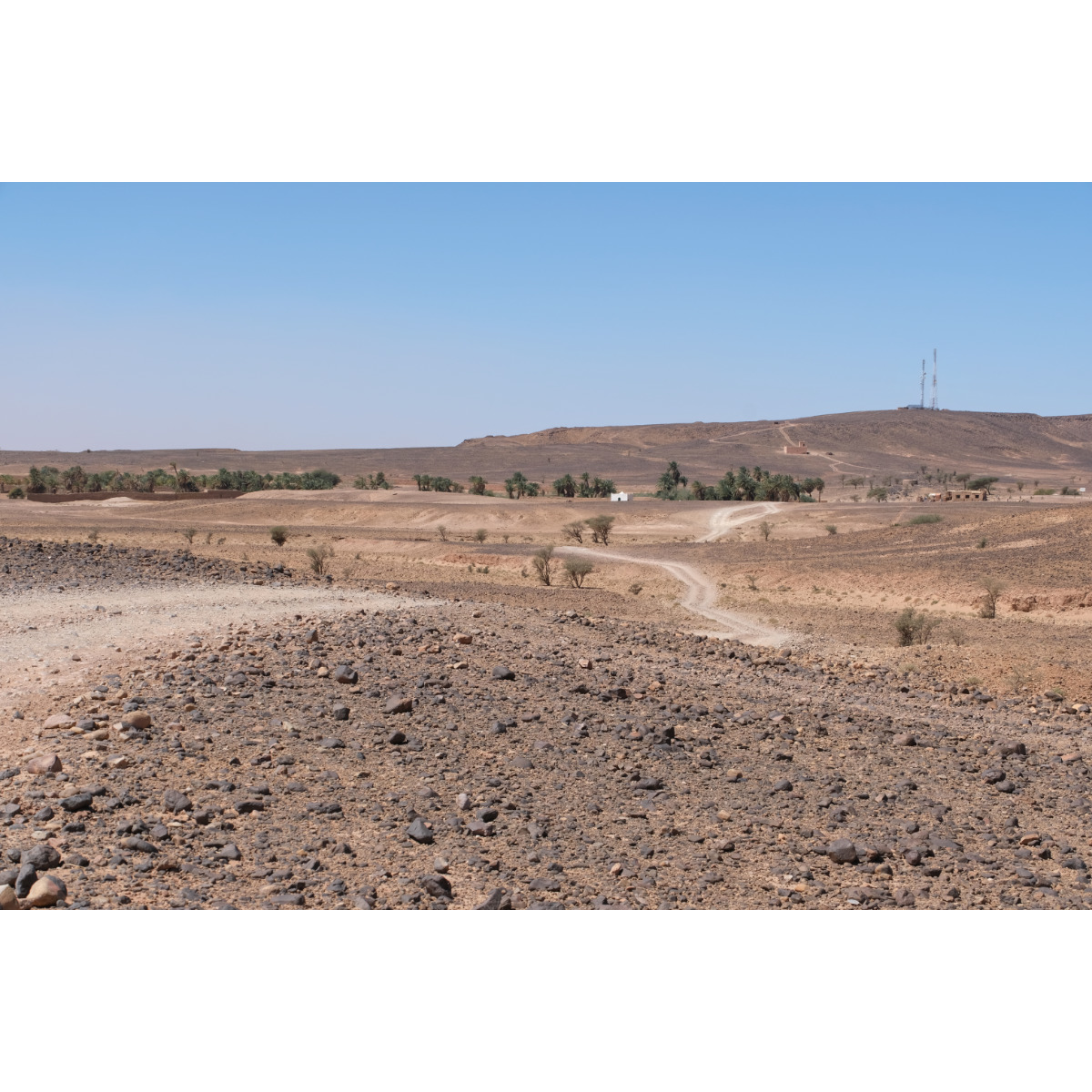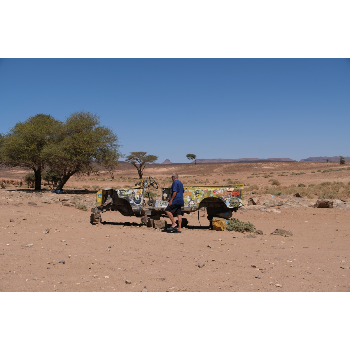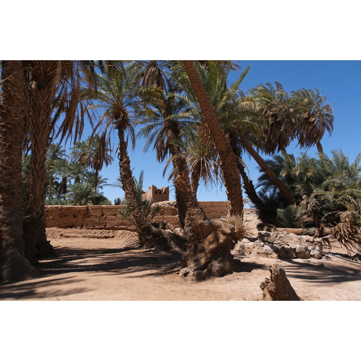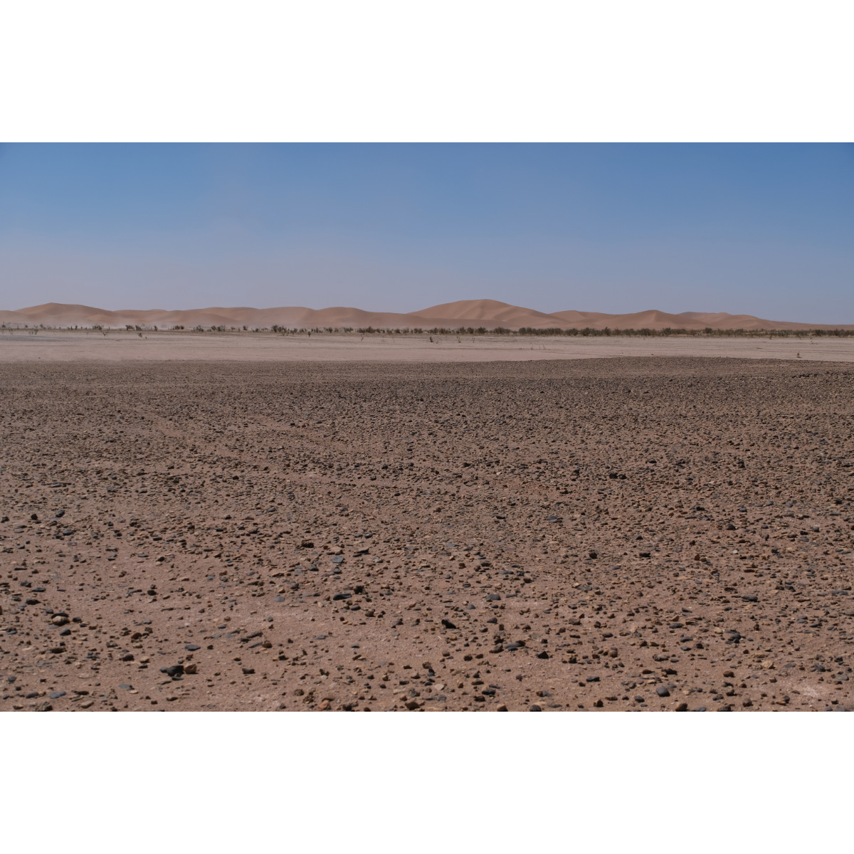 Teil I) Erg Chegaga, mit 150qkm die größte Sandwüste Marokkos. Die Chegaga ist wesentlich weniger frequentiert als die Chebbi, die Anfahrt ist länger und das letzte Drittel unangenehme Wellblechpiste. Mit viel Wind und meist wenig Sicht ging’s los, das Reifendruck ablassen war kein Spaß, sogar der Storch ließ sich zum Schutz vor dem Sand hinter einem Gestrüpp nieder. Gegen Mittag ließ der Wind nach. Wir verließen unsere eigentliche Route und nahmen Kurs auf die heilige Oase Oum Lâalag. Heute ist sie ziemlich verlassen, ein „Investor“ hat sie ringsum mit einer Mauer versehen und sie bröselt so vor sich hin - sehr schade! Davor saß eine Frau im Schatten, bastelte Kamele für die Touris und verkaufte warme Softdrinks in Dosen. Wir wandten uns wieder den Dünen zu, zurück auf unsere Route …