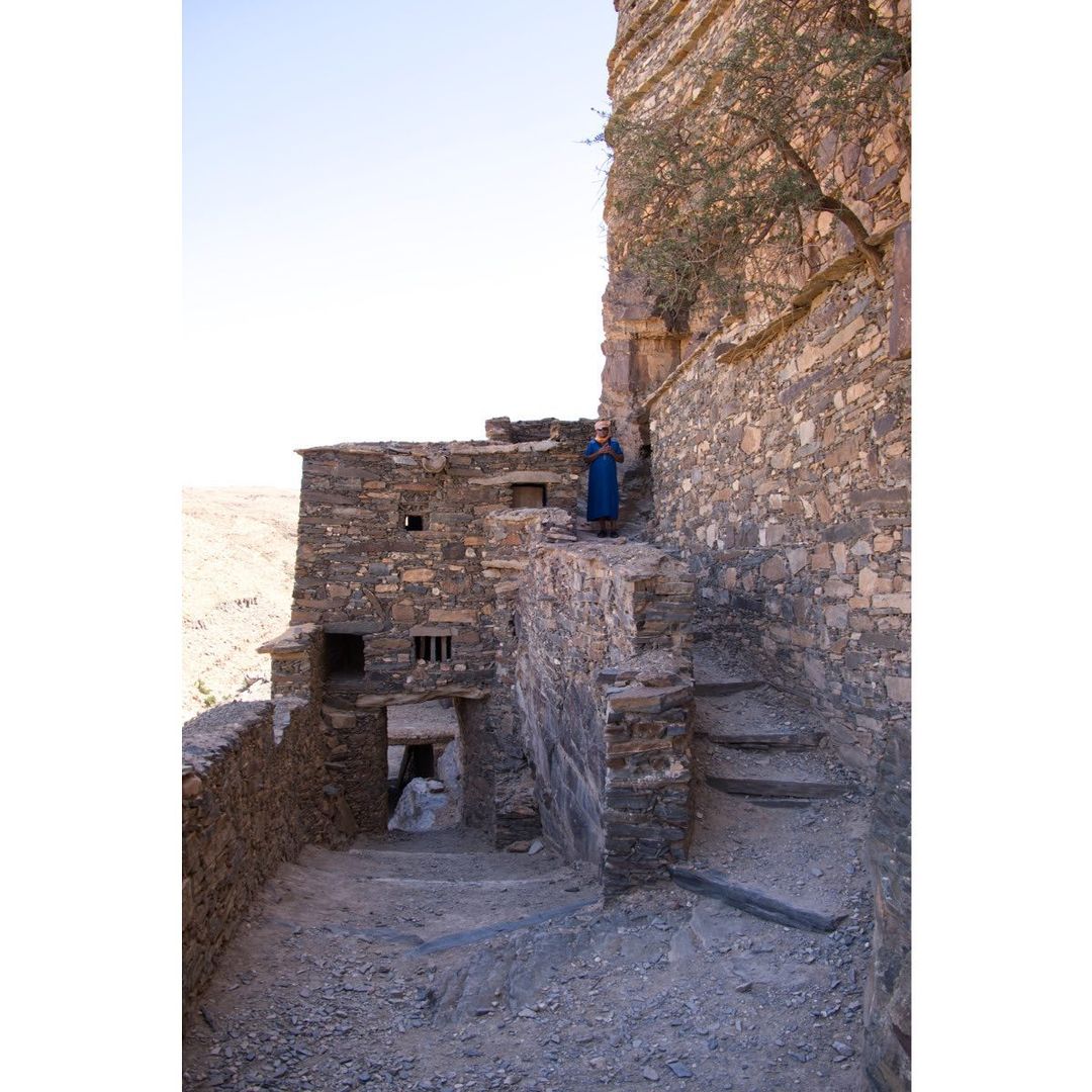 Amtoudi liegt in einem canyonartigen Flusstal der südwestlichen Ausläufer des Anti-Atlas. Dort befinden sich zwei der eindrucksvollsten Agadire (Speicherburgen) Marokkos. Beide liegen in grandioser Lage auf hohen Felsvorsprüngen, durch welche sie auf drei Seiten vor Angriffen geschützt sind. Wir stiegen hinauf zum Agadir Id Aïssa, eine beeindruckende burgähnliche Anlage. Es gibt dort mehrere Vorratsräume, drei Zisternen, eine ganze Reihe Bienenstöcke und ein kleines Museum, stolz präsentiert von einem alten Berber. Der Blick hinunter talauswärts auf den neuen Ort und taleinwärts auf das alte Dorf. Nach dem Abstieg wanderten wir weiter durch die Oase in der Schlucht, mit Blick auf den Agadir Agellouy.