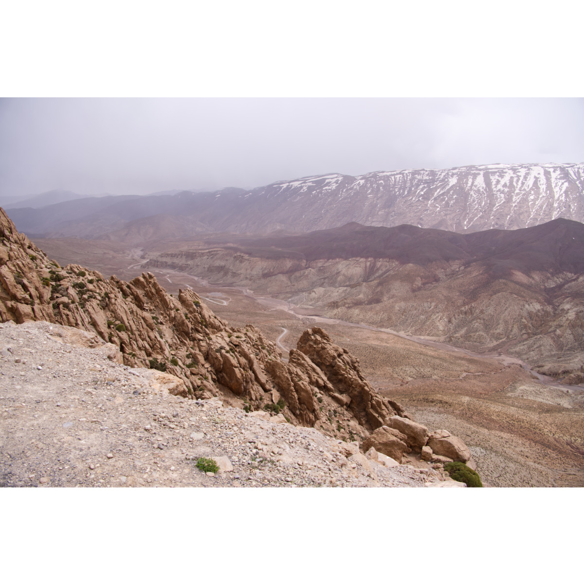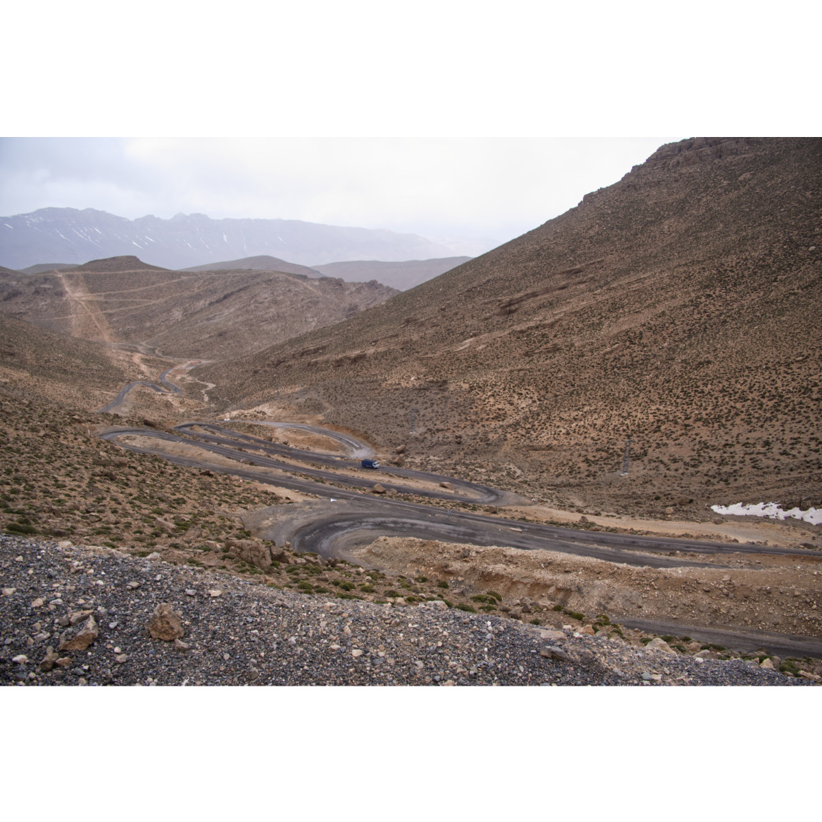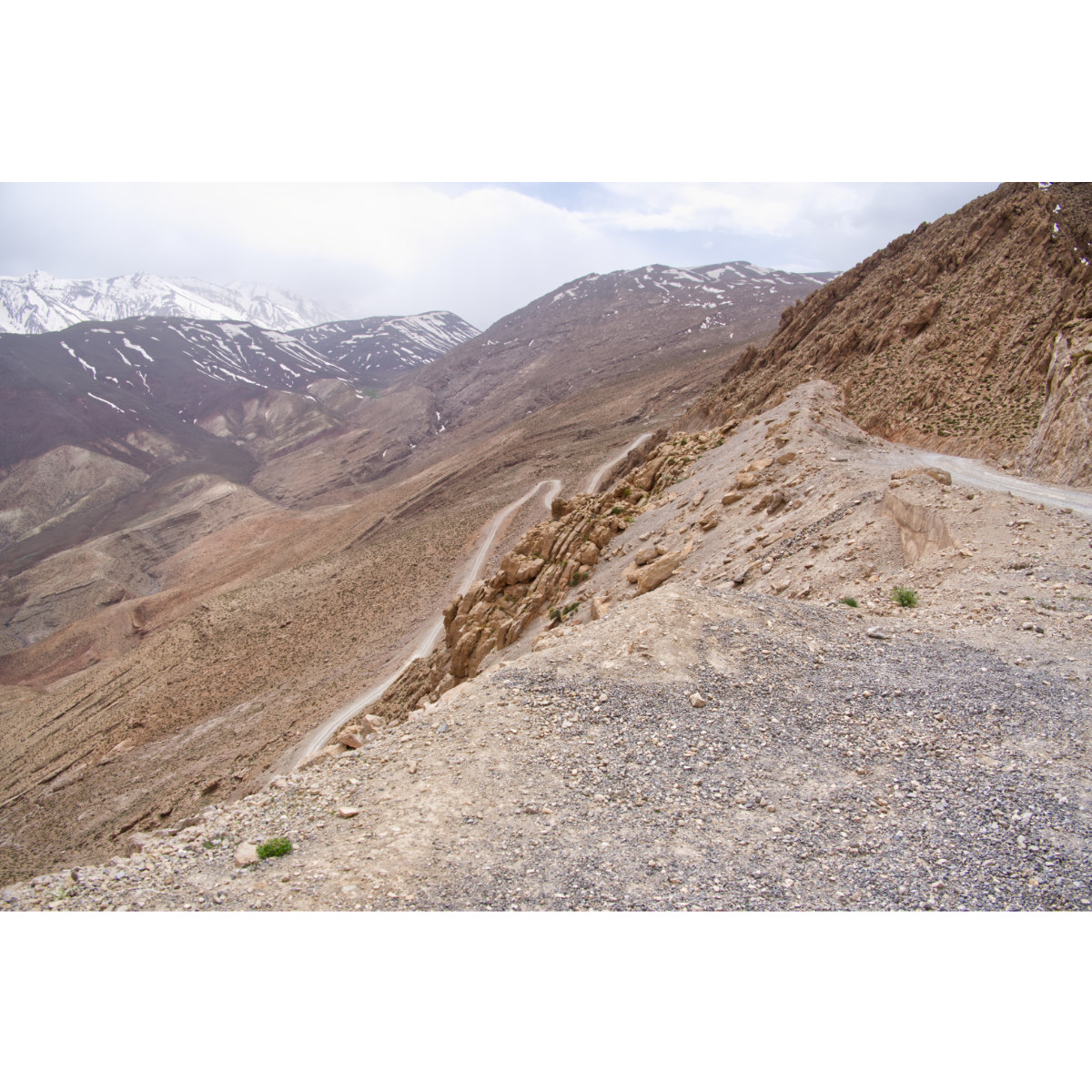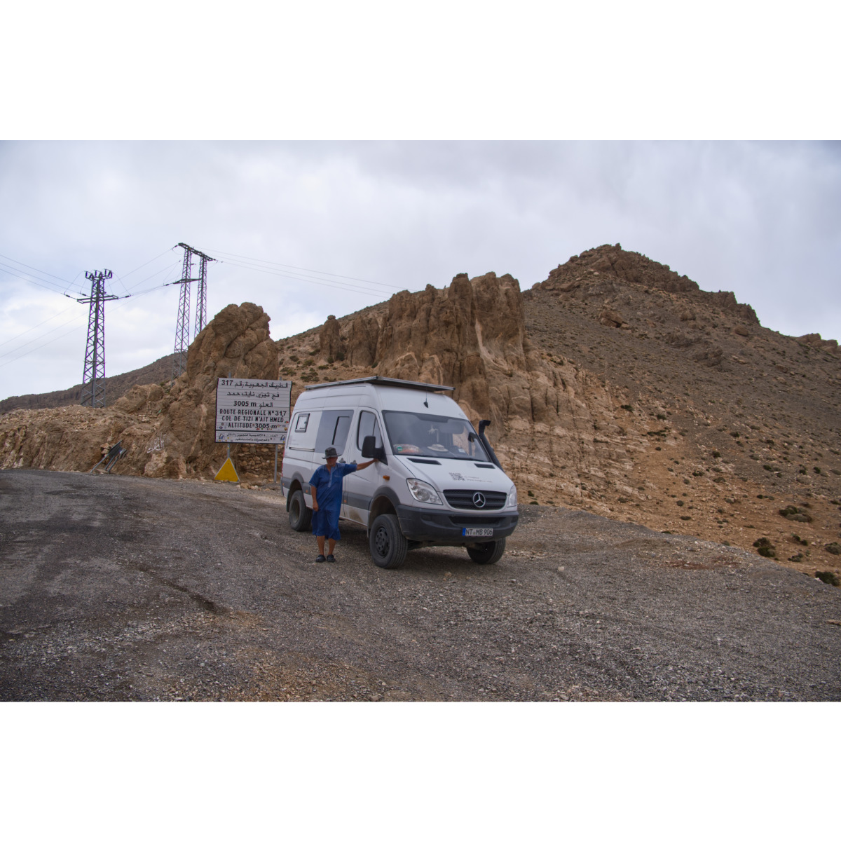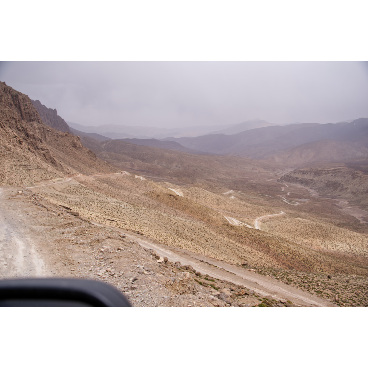 Vom CP Dar Ahansal geht es zunächst nach Tabant. Dort biegen wir ab auf eine Straße, die über 3 Pässe nach Amejgag führt. Die Strecke wurde uns von einem Ulmer Paar empfohlen, das wir unterwegs getroffen hatten. Die Schranke ist offen, die Straße wie berichtet asphaltiert, also kein Problem. Auf 2905m angekommen ändert sich die Sache, die Abfahrt ist nicht mehr asphaltiert, aber die Piste sieht soweit ganz gut aus. Alles geht gut, ab der Talsohle haben wir auch wieder Asphalt unter den Rädern. Der zweite Pass (2780m) ist unspektakulär, der dritte hingegen geht auf 3005m hoch. Am Straßenrand hat es sogar noch etwas Schnee, Leitplanken oder sonstige Absicherung gibt es hier nicht, dafür ist die Straße schmal und die Abhänge sind steil und lang … Das Wetter wird ungemütlich, also machen wir keine großen Pausen. Schließlich erreichen wir die Oase von Amejgag. Es ist noch früh, wir fahren weiter durch das Tal der Rosen nach Kalaat M‘Gouna.