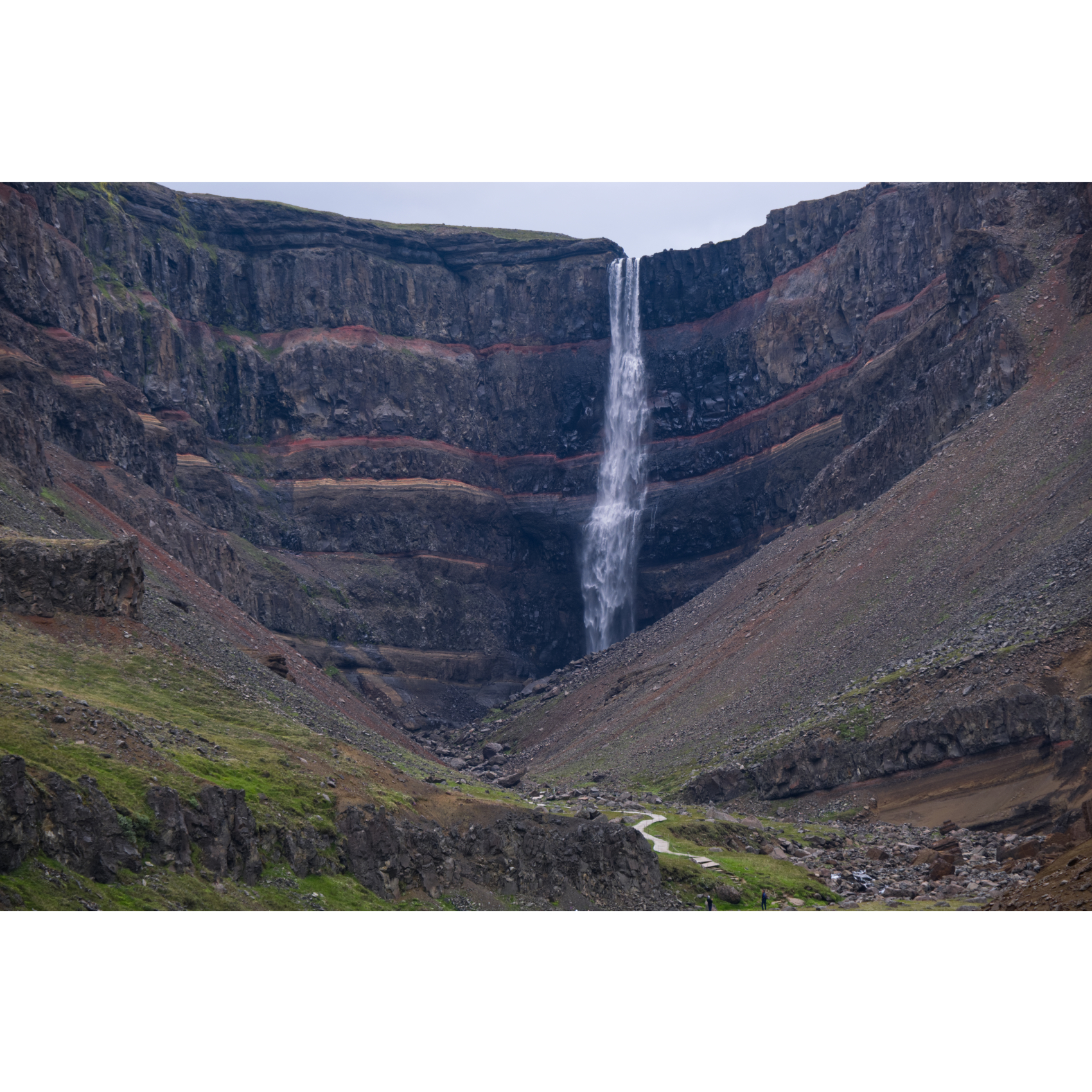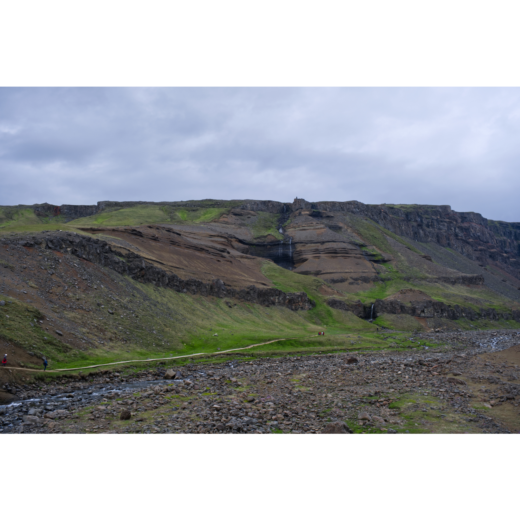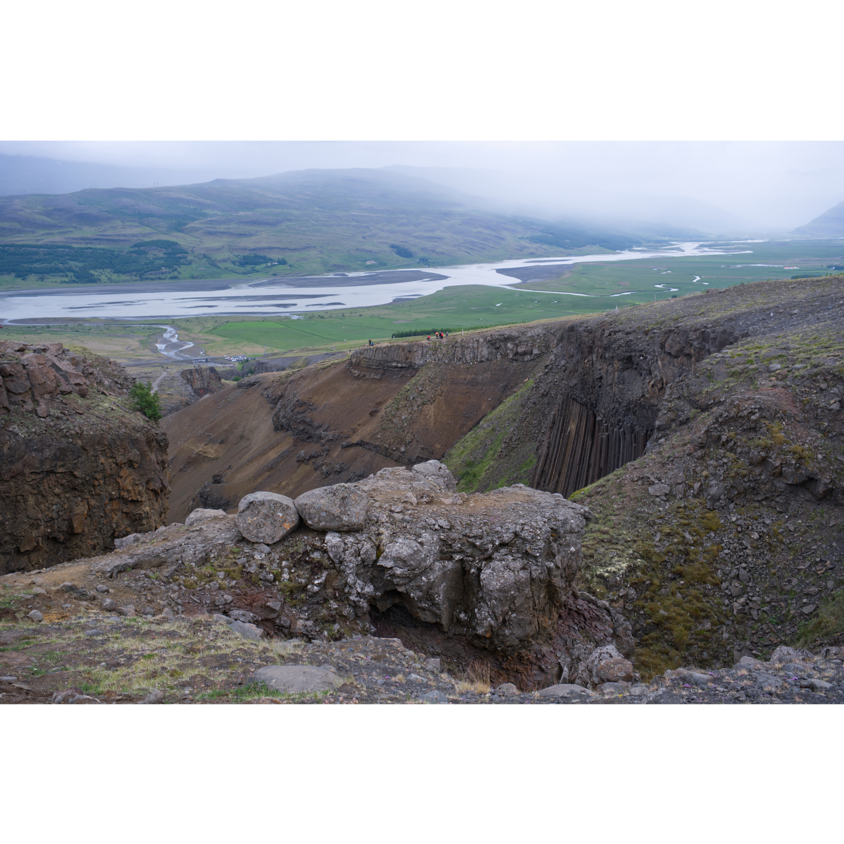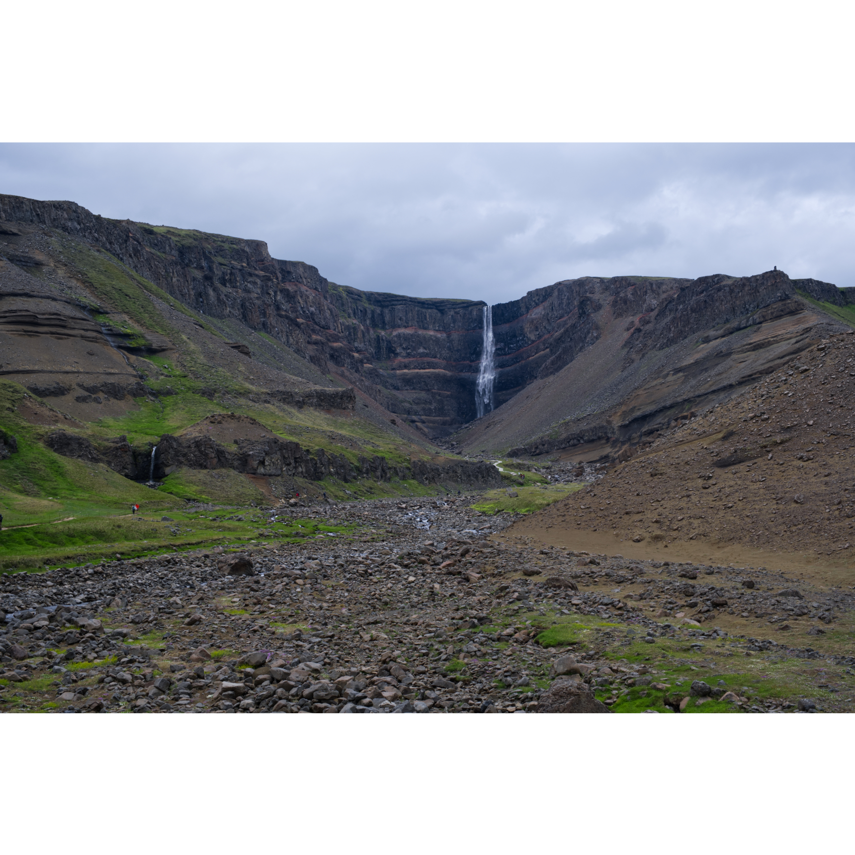 Eine kurze Fahrt von 60km nach Südwesten zum Hengifoss. Unterwegs passierten wir bereits einige andere Wasserfälle, die ersparen wir euch aber mal. Der Hengifoss ist mit 128m Fallhöhe einer der höchsten in Island. Bei Sonnenschein leuchten die roten Tonstreifen zwischen den Basaltschichten, kann man sich zumindest vorstellen. Das letzte Stückchen Weg ist gesperrt wegen Steinschlags - die Felsbrocken vom letzten Mal liegen noch da … Die Basaltsäulen am Wasserfall Litlanesfoss im unteren Verlauf des Flusses haben sich durch die langsame Abkühlung der Lava in einer kleinen Mulde vor etwa 6 Millionen Jahren gebildet. Eine schöne Wanderung von ca. 5km Länge mit ordentlicher Steigung - ein schöner Nachmittag!