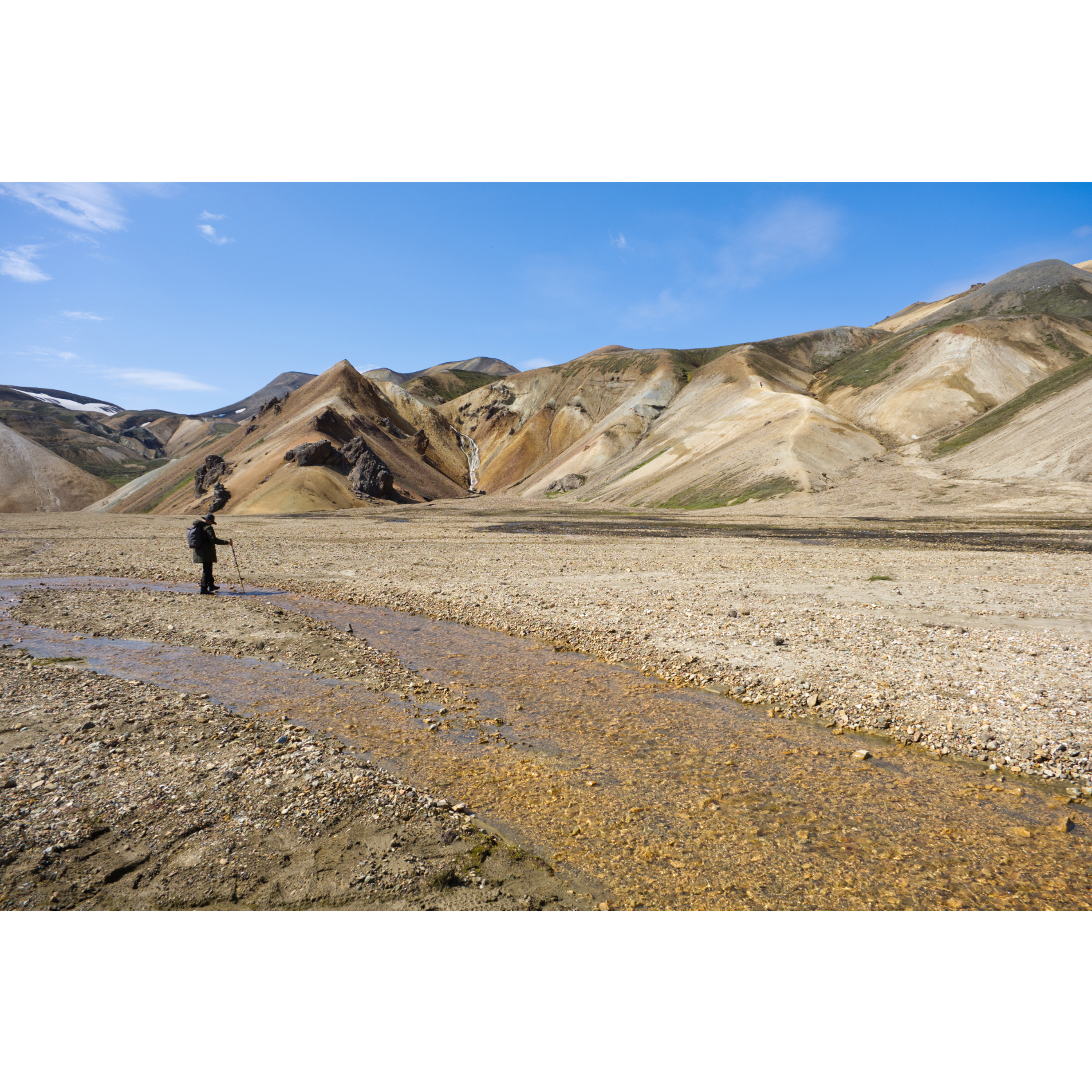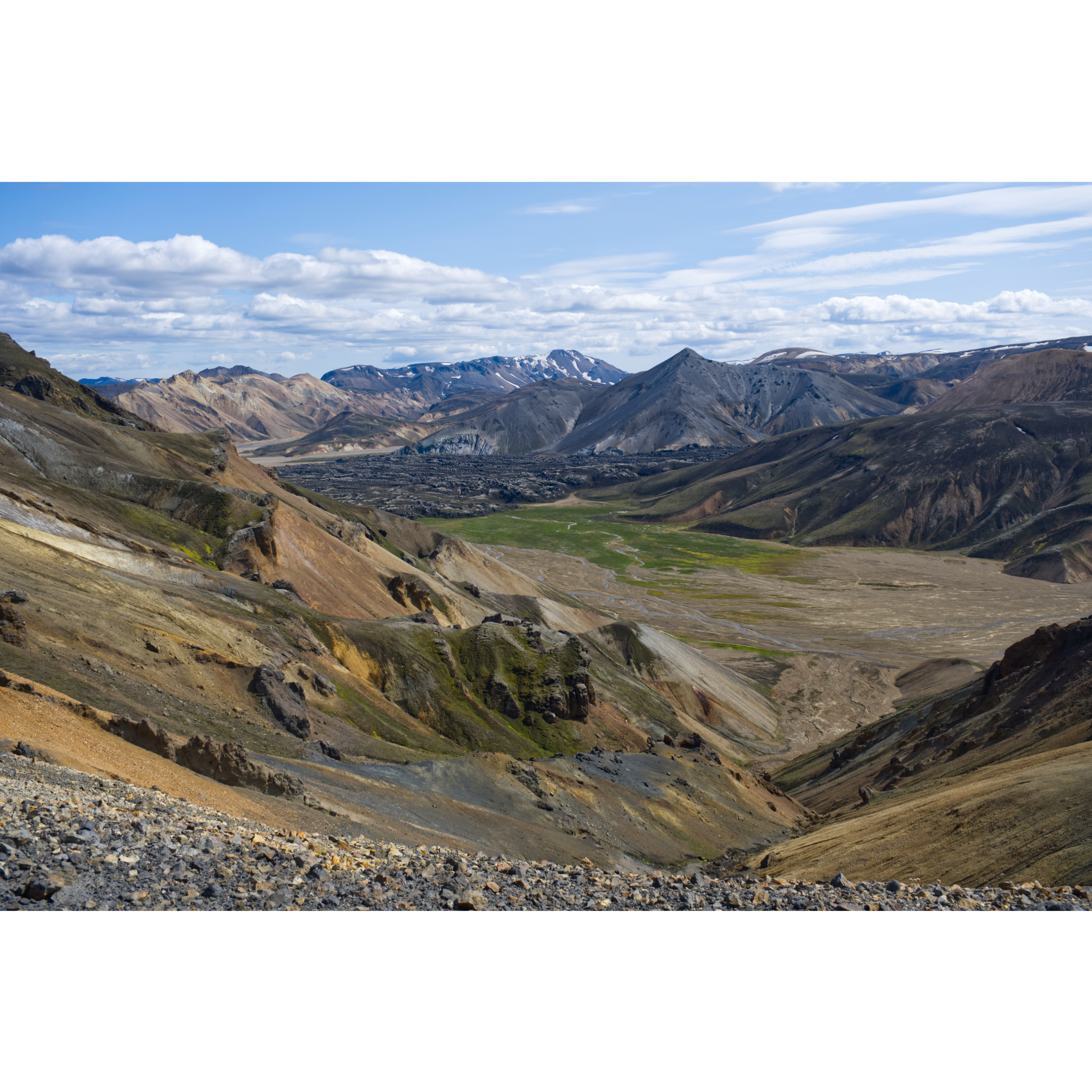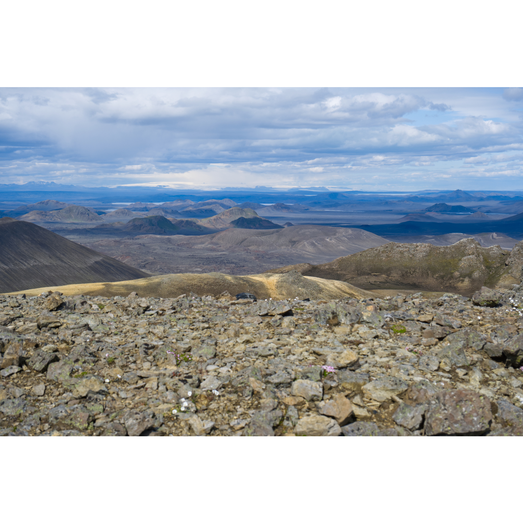 Das Wetter blieb stabil, so nahmen wir die Suðurnámur Panoramarunde unter die Füße. Auf diesmal breitem Weg ging es an anderer Stelle durch das Lavafeld zum Suðurnámur und auf dem Kamm entlang. Die Aussicht reicht nach Norden bis zu den Gletschern, nach Süden in die Täler von Landmannalaugar und auf das riesige Laugahraun-Lavafeld. Die Schönheit dieser Landschaft erfüllt einen gleichzeitig mit Glück und Demut und hat sich in unsere Herzen eingebrannt. Klingt vielleicht etwas schwülstig, ist aber so. Landmannalaugar gehört zum Schönsten, was wir bisher auf unseren Reisen gesehen haben und die beiden Tage dort werden wir sicher nicht mehr vergessen.