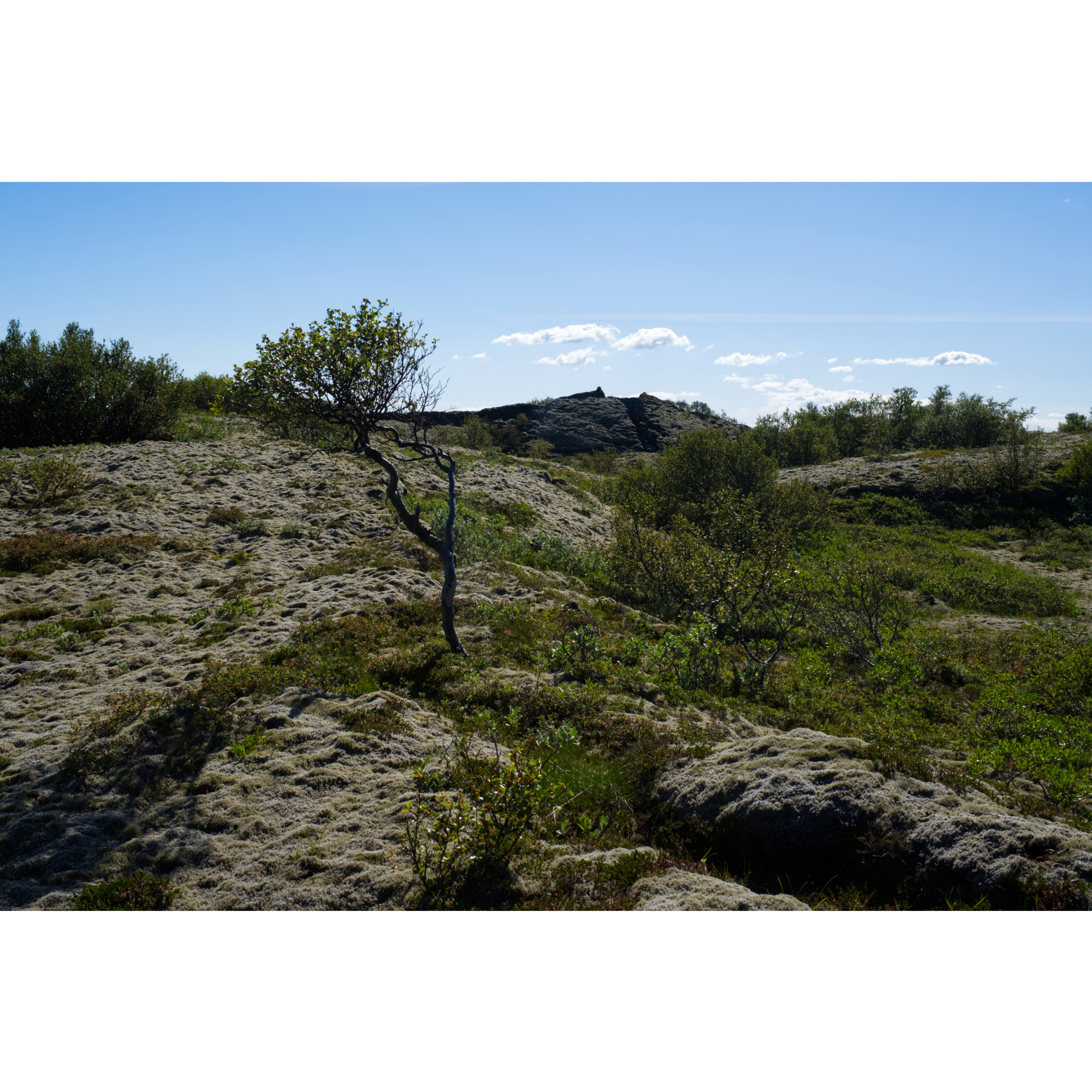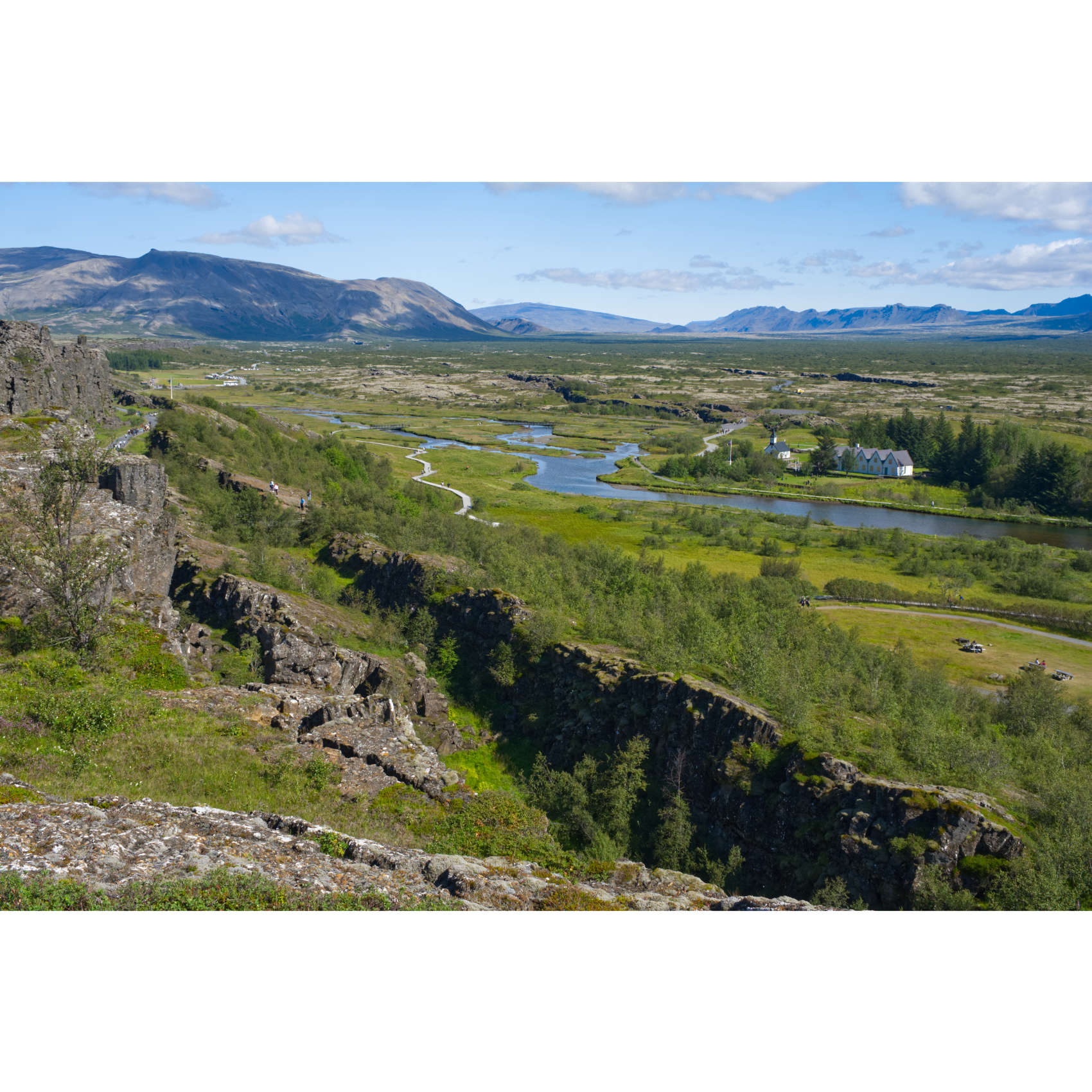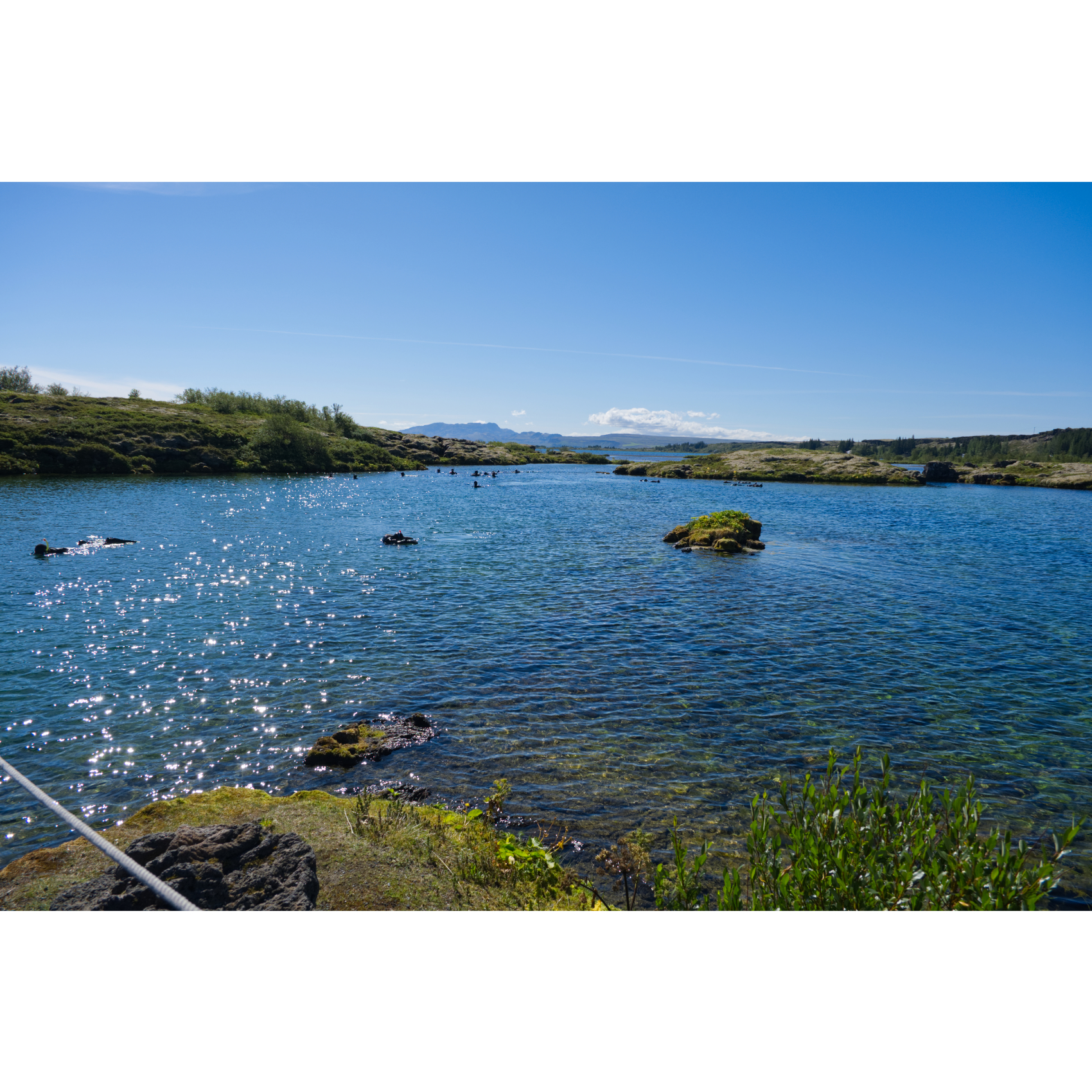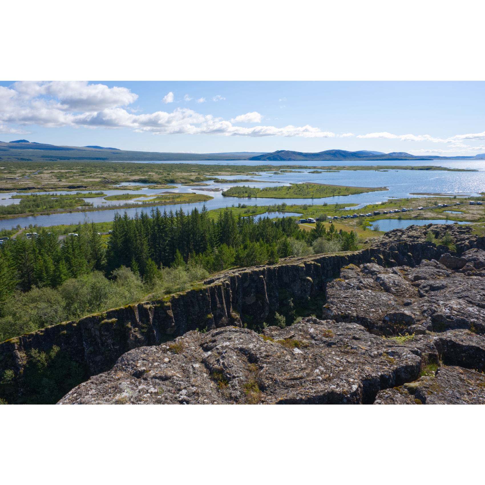 Für unsere Wanderung im Nationalpark Þingvellir spendierte uns der Wettergott das schönste Wetter mit angenehm warmen Temperaturen. Das Gebiet liegt inmitten einer Grabenbruchzone und ist umgeben von vier aktiven Vulkansystemen. Hier wird das Auseinanderdriften der amerikanischen und eurasischen tektonischen Platten durch imposante Felsspalten und Risse sichtbar, vor allem an der Almannagjá (Allmännerschlucht) oder auch der Silfra-Spalte. Diese hat sich zu einem außergewöhnlichen Tauchplatz entwickelt. Hier kann man in einer Schlucht östlich der Mündung der Öxará in glasklarem Wasser schnorcheln oder tauchen. Der Name Þingvellir bedeutet Volksversammlung. An diesem Ort wurde die traditionelle Versammlung Althing abgehalten, die sowohl gesetzgeberische als auch gerichtliche Funktion hatte. Es handelt sich um eines der ältesten Parlamente der Welt. Eine Flagge markiert den Lögberg, den Gesetzesberg, wo der Gesetzessprecher stand und die Gesetze verkündete, die hinter seinem Rücken aufragende Wand der Allmännerschlucht als natürlichen Verstärker benutzend. Der Rückweg zum Campingplatz führte uns durch ein altes Lavafeld, über und über mit Moos bewachsen, ein paar Moorbirken dazwischen, märchenhaft schön.