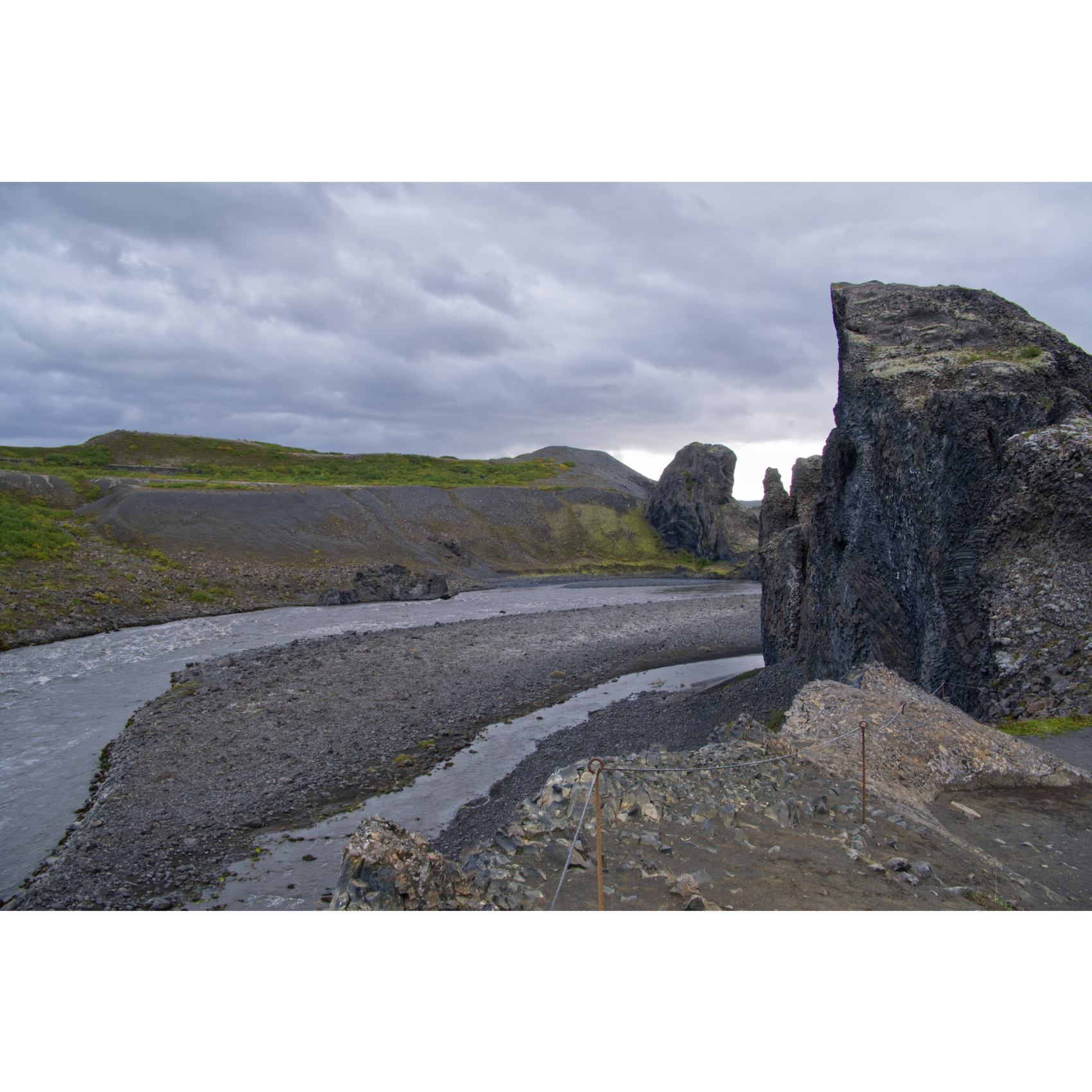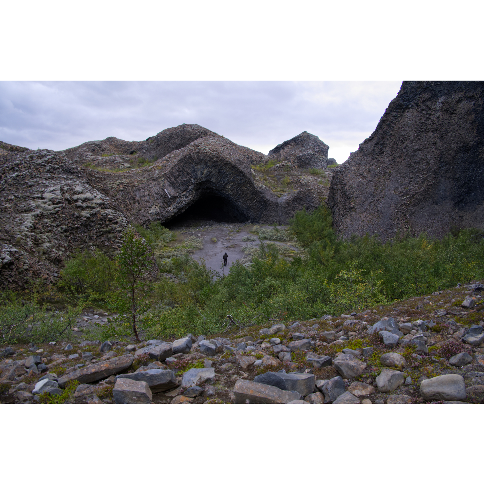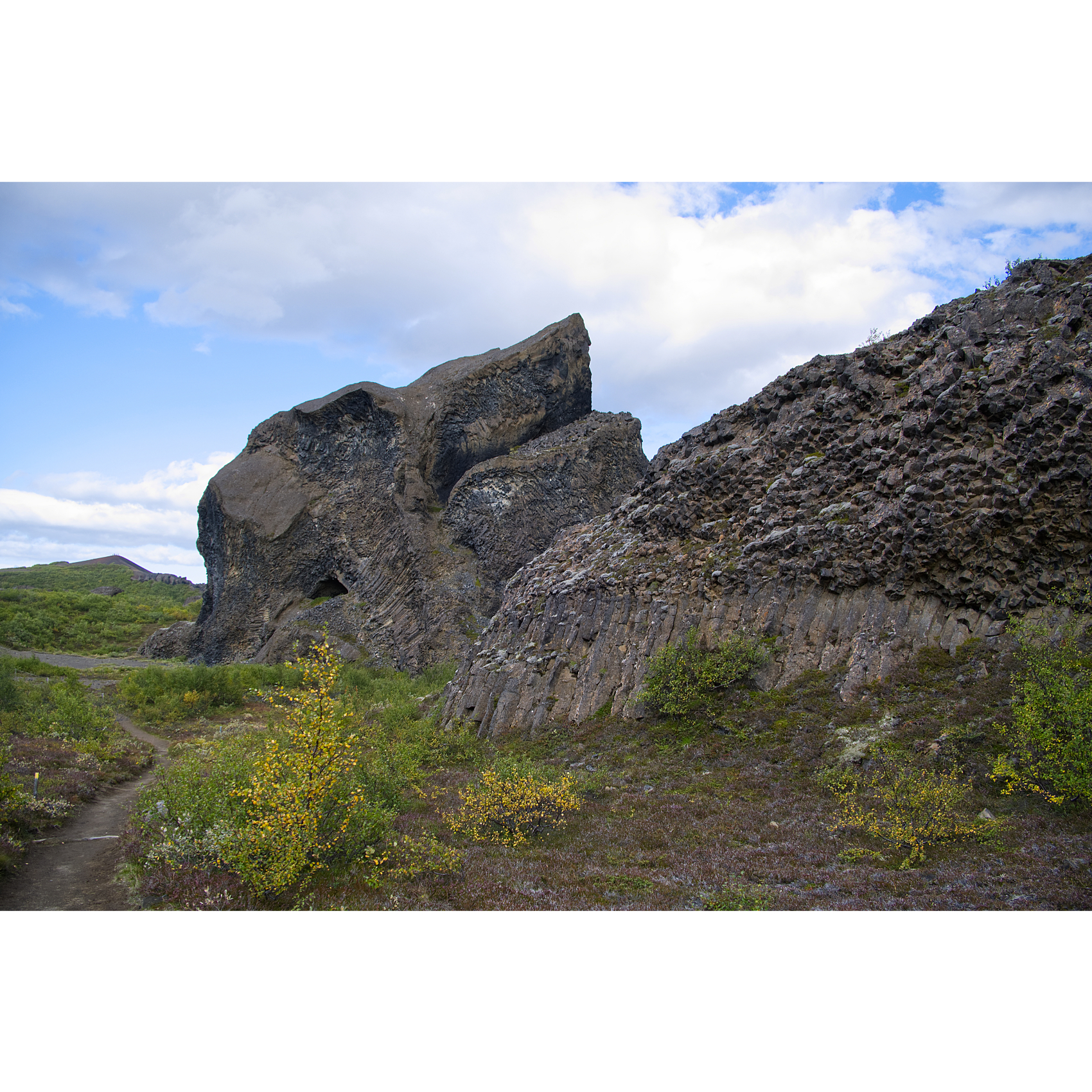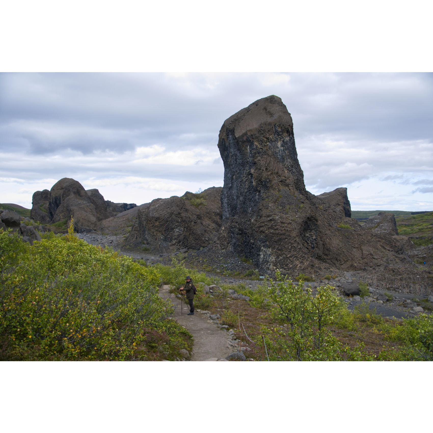 Die mächtigen Hljóðaklettar (Echofelsen) sind nüchtern betrachtet die Überreste alter Vulkane, die der Jökulsá erodiert hat. Nur die Vulkanstöpsel sind noch übrig. Die Lava ist hier in Form von Basaltsäulen erstarrt. Solche Formen entstehen, wenn sich die flüssige Lava sehr schnell abkühlt. Man könnte sie aber auch für versteinerte Wesen halten. Zumindest der große Troll und der Dackel sind doch eindeutig zu identifizieren, oder? Der nördliche Krater, Rauðhólar, ist vor den Gletscherfluten geschützt und als roter Aschenkegel erhalten. Ein Stück weiter flussaufwärts trifft man auf Karl og Kerling (= alter Mann und alte Frau), ein Trollpaar, das beim Streiten kurz vor ihrer Höhle den Sonnenaufgang übersehen hat und deshalb zu Stein erstarrte.