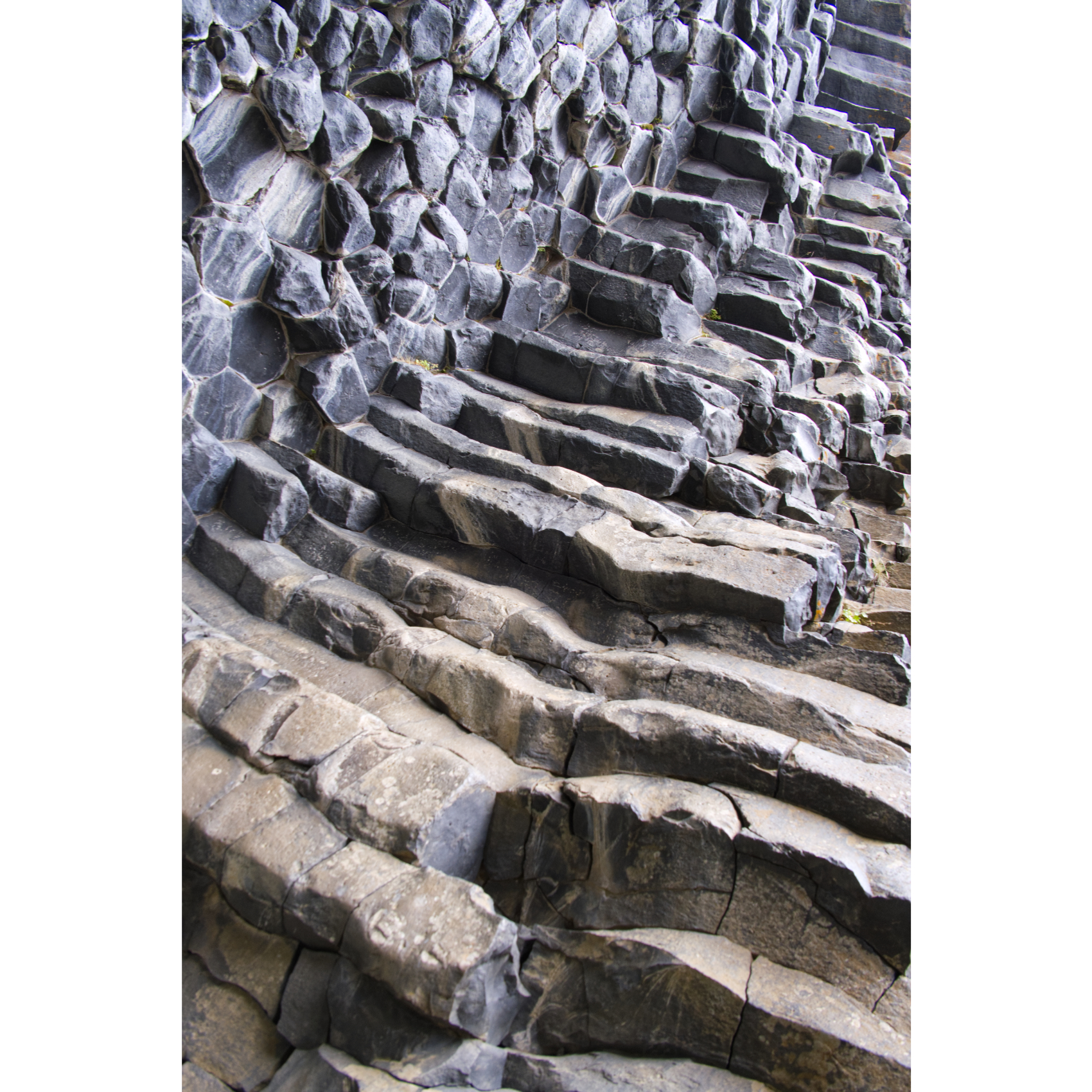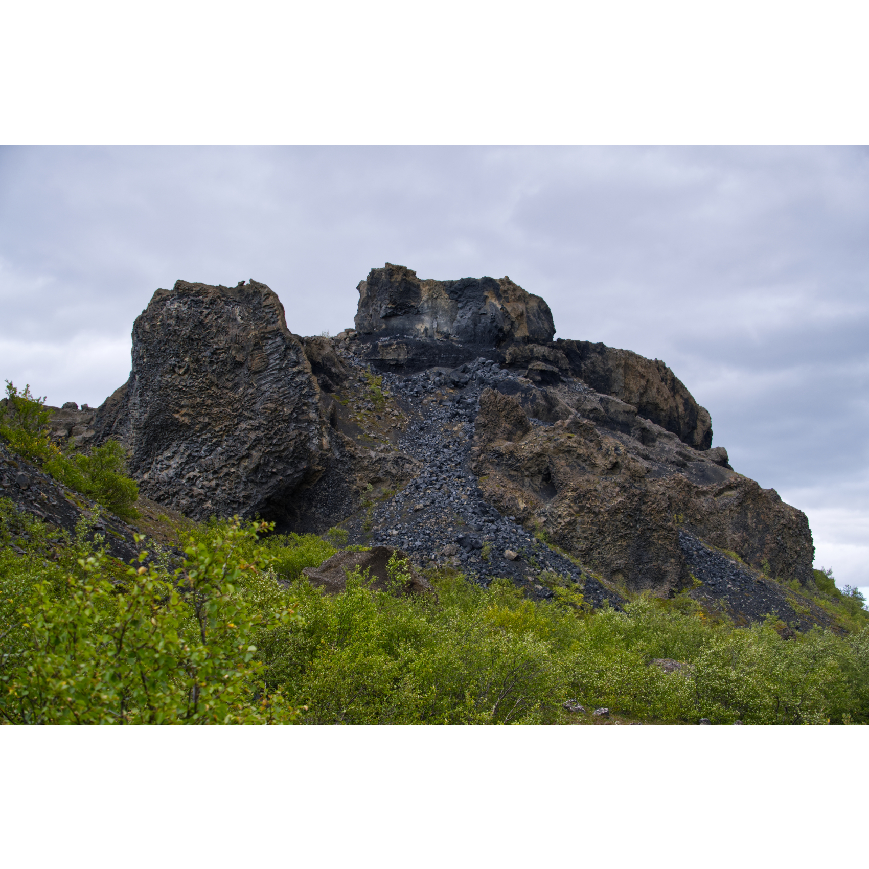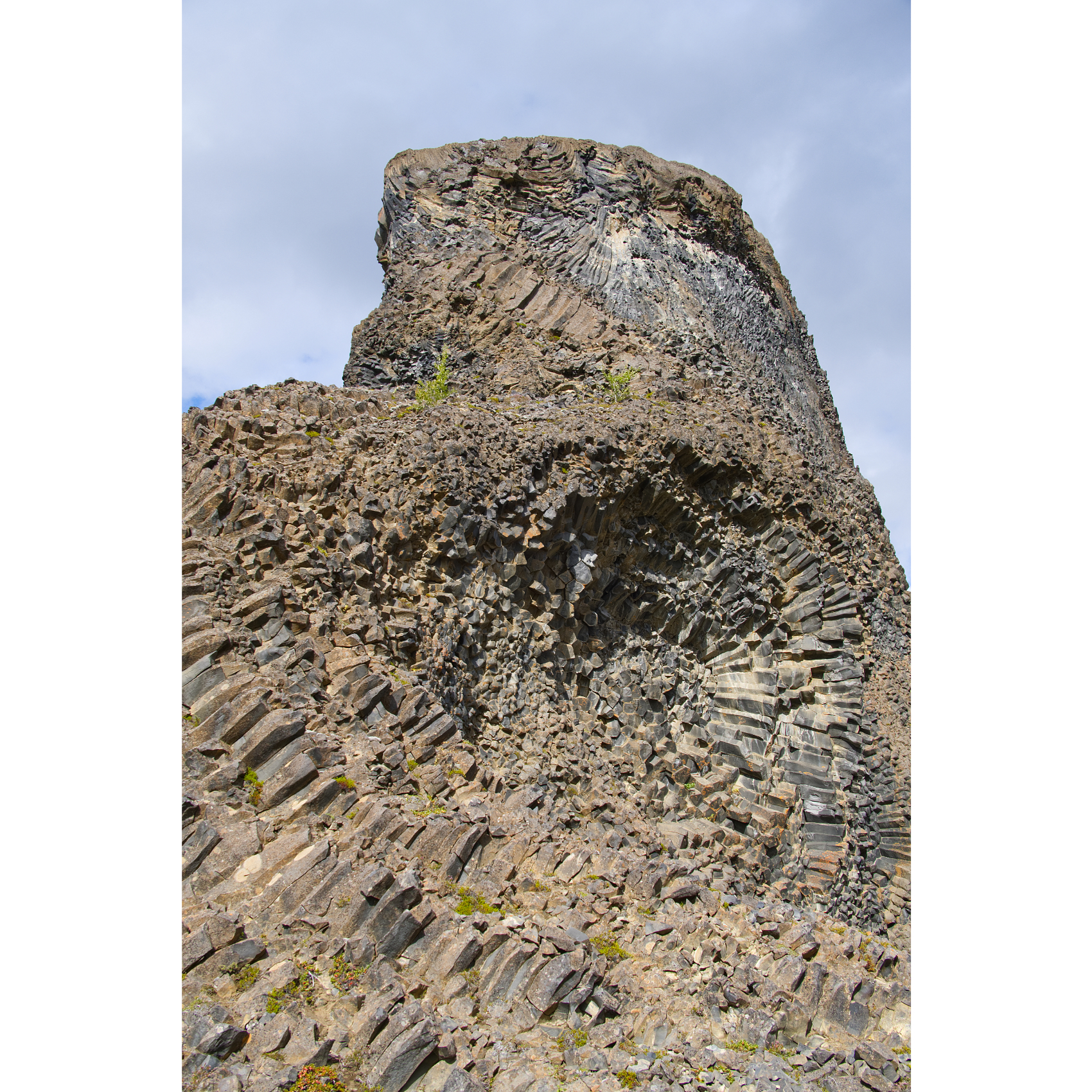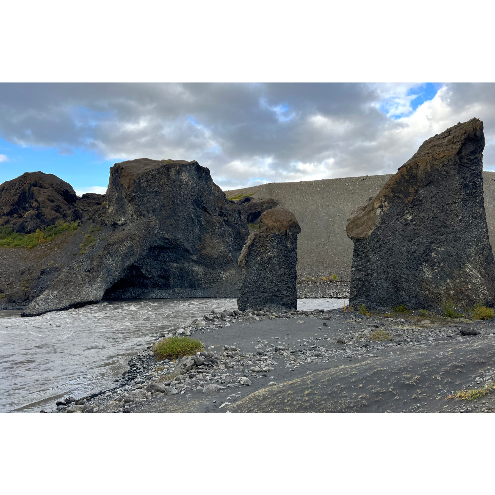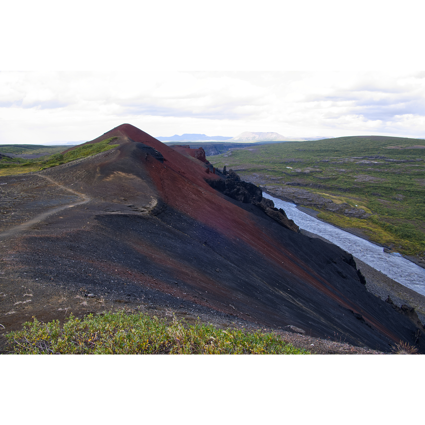Die mächtigen Hljóðaklettar (Echofelsen) sind nüchtern betrachtet die Überreste alter Vulkane, die der Jökulsá erodiert hat. Nur die Vulkanstöpsel sind noch übrig. Die Lava ist hier in Form von Basaltsäulen erstarrt. Solche Formen entstehen, wenn sich die flüssige Lava sehr schnell abkühlt. Man könnte sie aber auch für versteinerte Wesen halten. Zumindest der große Troll und der Dackel sind doch eindeutig zu identifizieren, oder? Der nördliche Krater, Rauðhólar, ist vor den Gletscherfluten geschützt und als roter Aschenkegel erhalten. Ein Stück weiter flussaufwärts trifft man auf Karl og Kerling (= alter Mann und alte Frau), ein Trollpaar, das beim Streiten kurz vor ihrer Höhle den Sonnenaufgang übersehen hat und deshalb zu Stein erstarrte.
