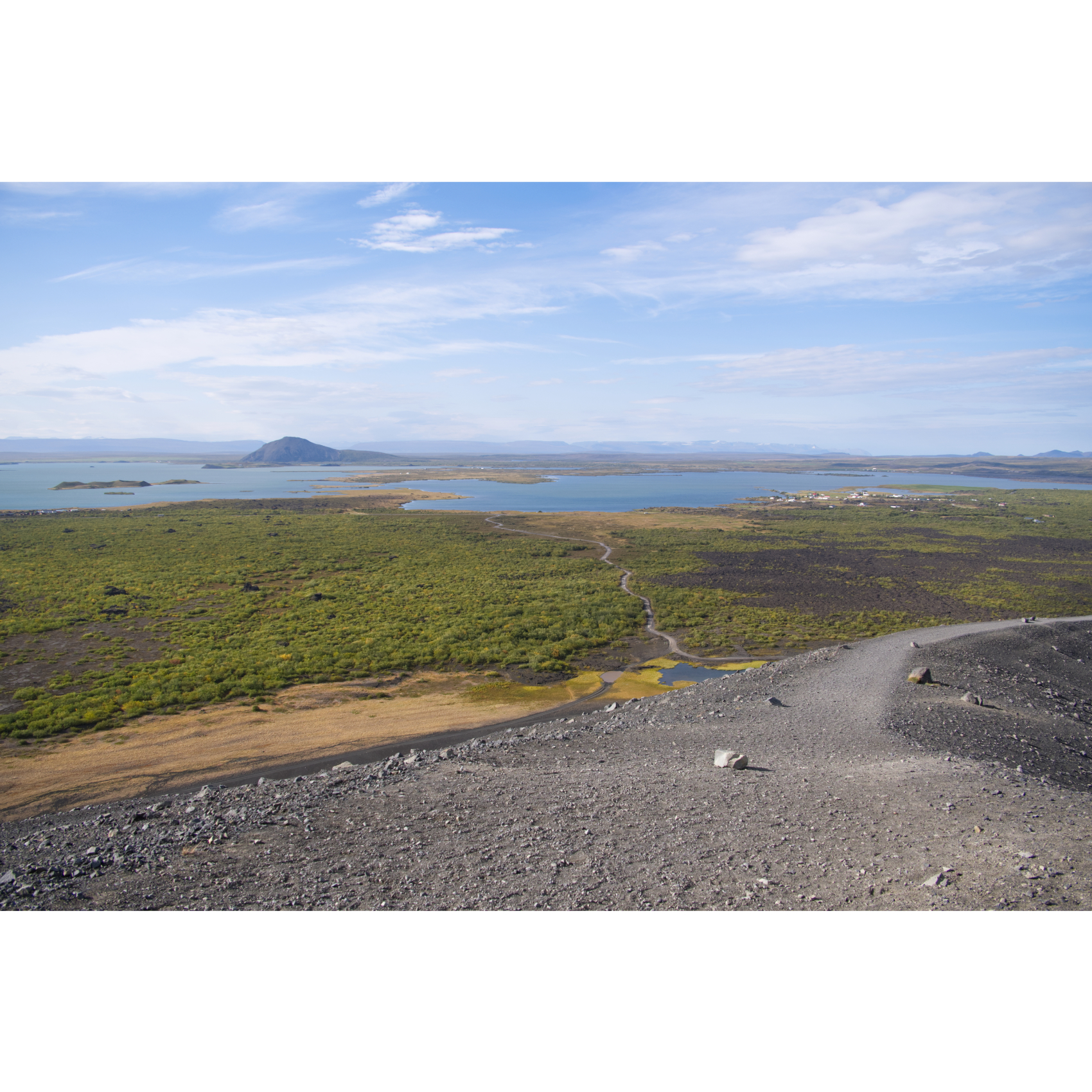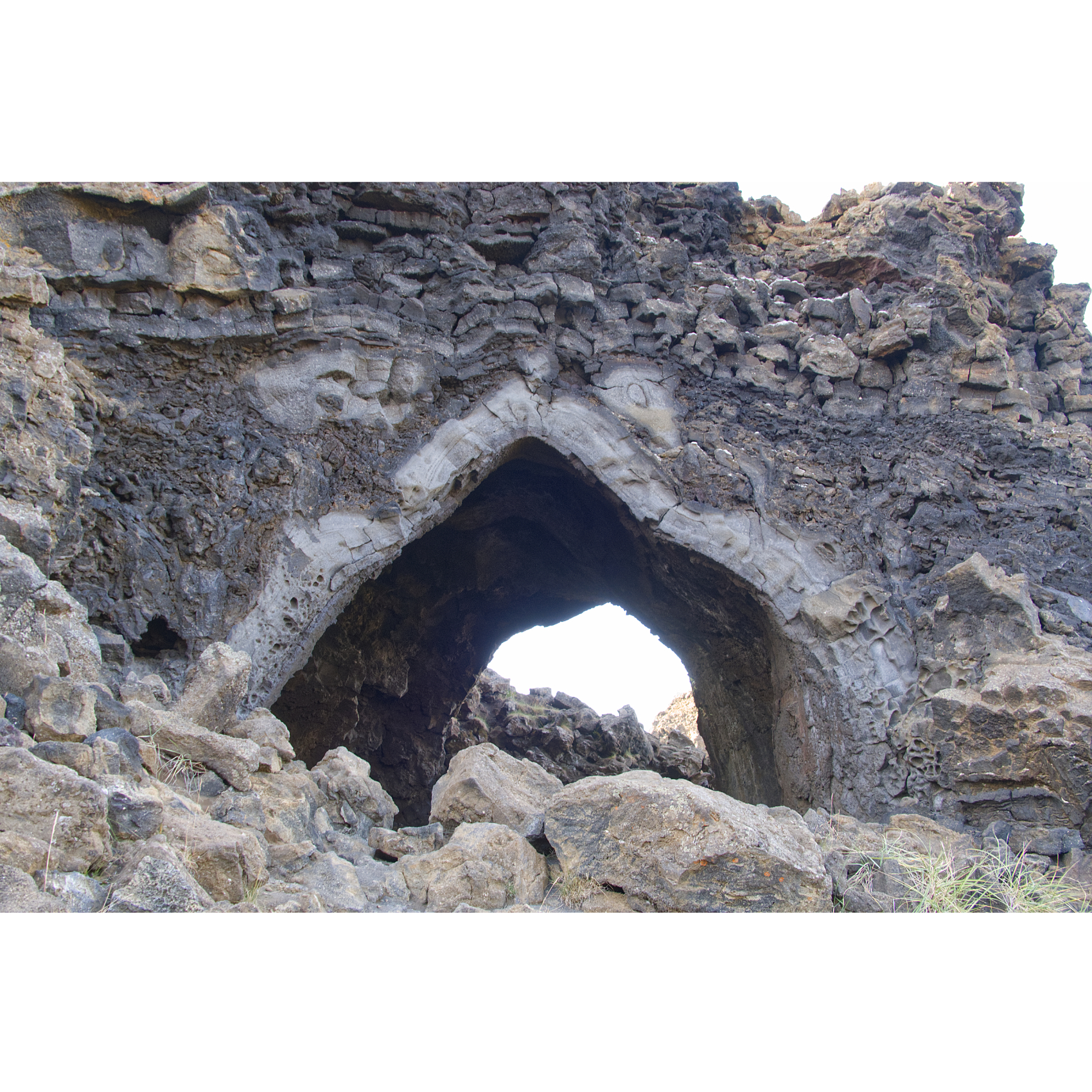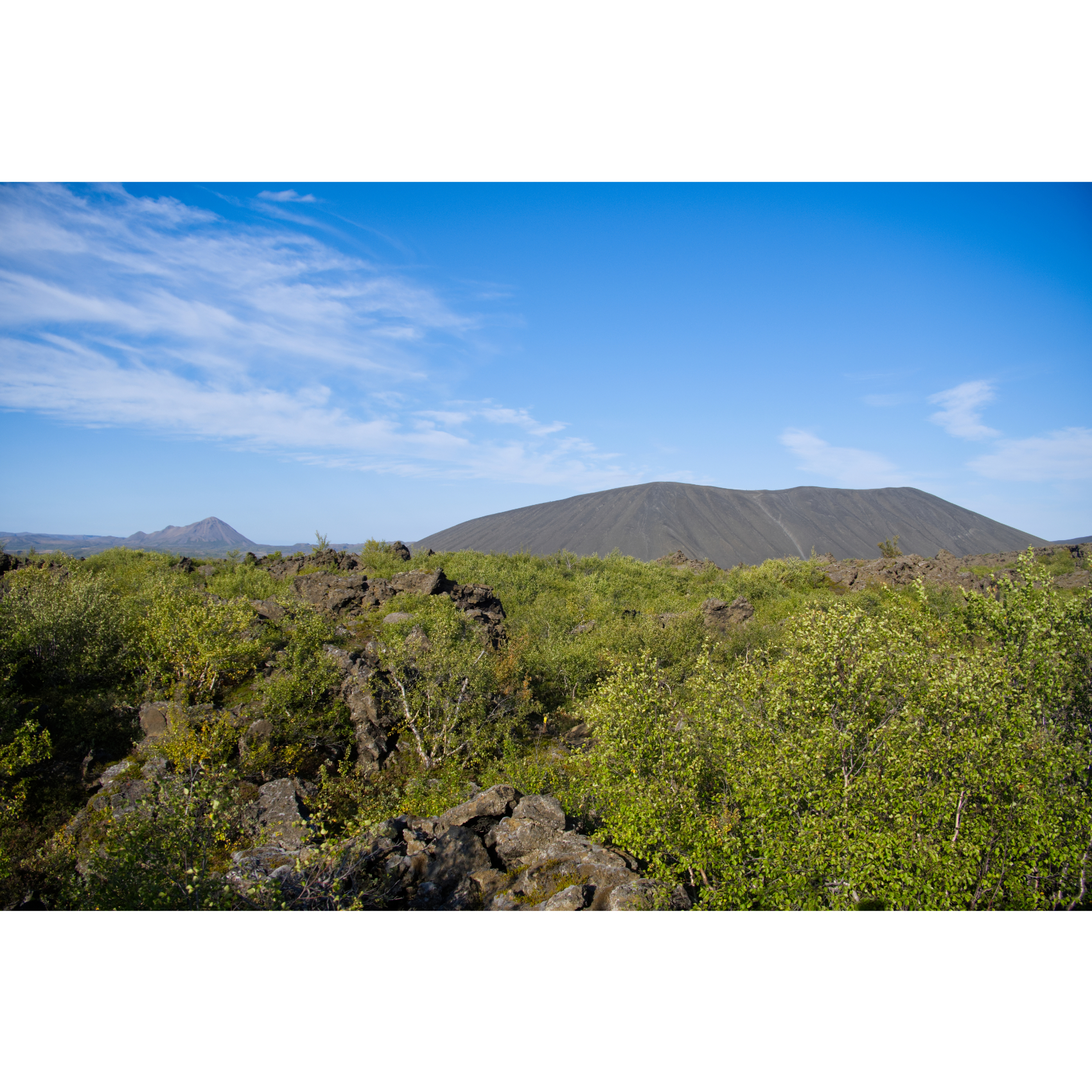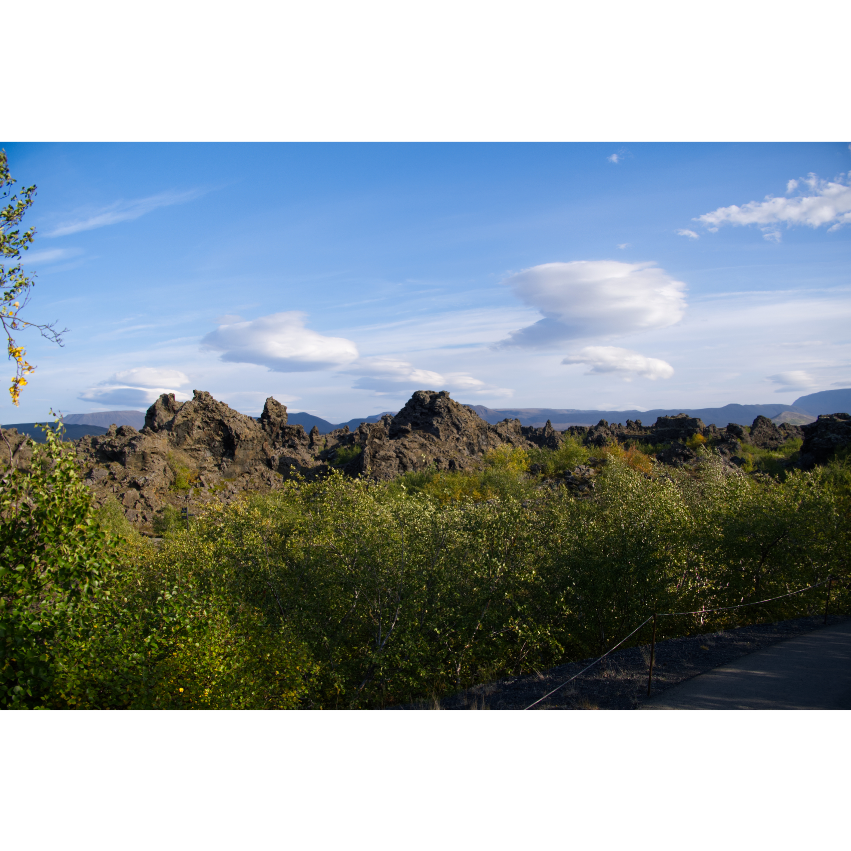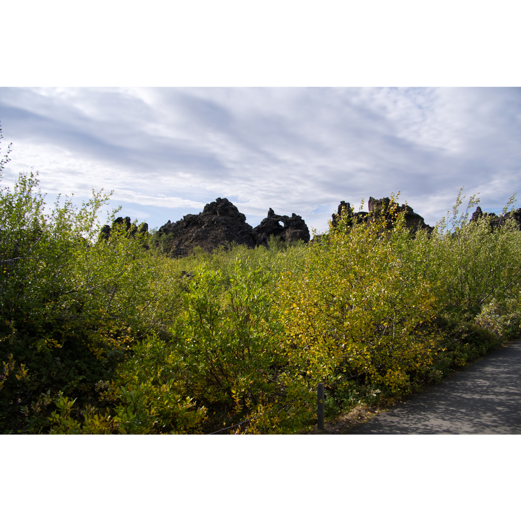 Rund um den Mývatn (Mückensee). Dimmuborgir (dunkle Städte/Burgen), ist die Heimat der 13 Yule Lads (Weihnachtsmänner), Söhne der bösartigen Trolle Grúla und Leppalúdi. In der Weihnachtszeit kommen sie einer nach dem anderen aus ihren Höhlen zu den Menschen und stecken nachts den Kindern kleine Geschenke in die Schuhe, wer nicht brav war bekommt eine rohe Kartoffel. Soweit die Sage. Entstanden ist das Lavafeld Dimmuborgir vor zirka 2.000 Jahren aus einem großen See, der bei einer Eruption mit der sogenannten Laxa-Lava überflutet wurde. Das verdampfende Wasser und die Lava schufen Hohlräume und damit diese phantastischen Formen. Ab 1942 wurde das Areal, das zu versanden drohte bepflanzt und geschützt, seit 2011 ist es Naturreservat. Heute kann man auf gut befestigten Wegen herumspazieren oder weiter zum Krater Hverfjall wandern, einem Tuffring mit ca. 1 km Durchmesser. Von dessen Rand aus hat man eine wunderbare Aussicht, z.B. auf den Mývatn.
