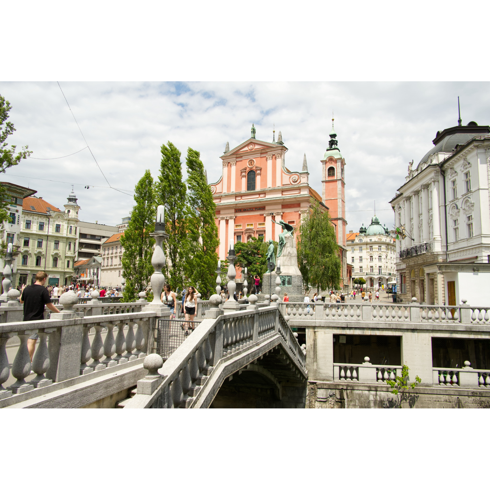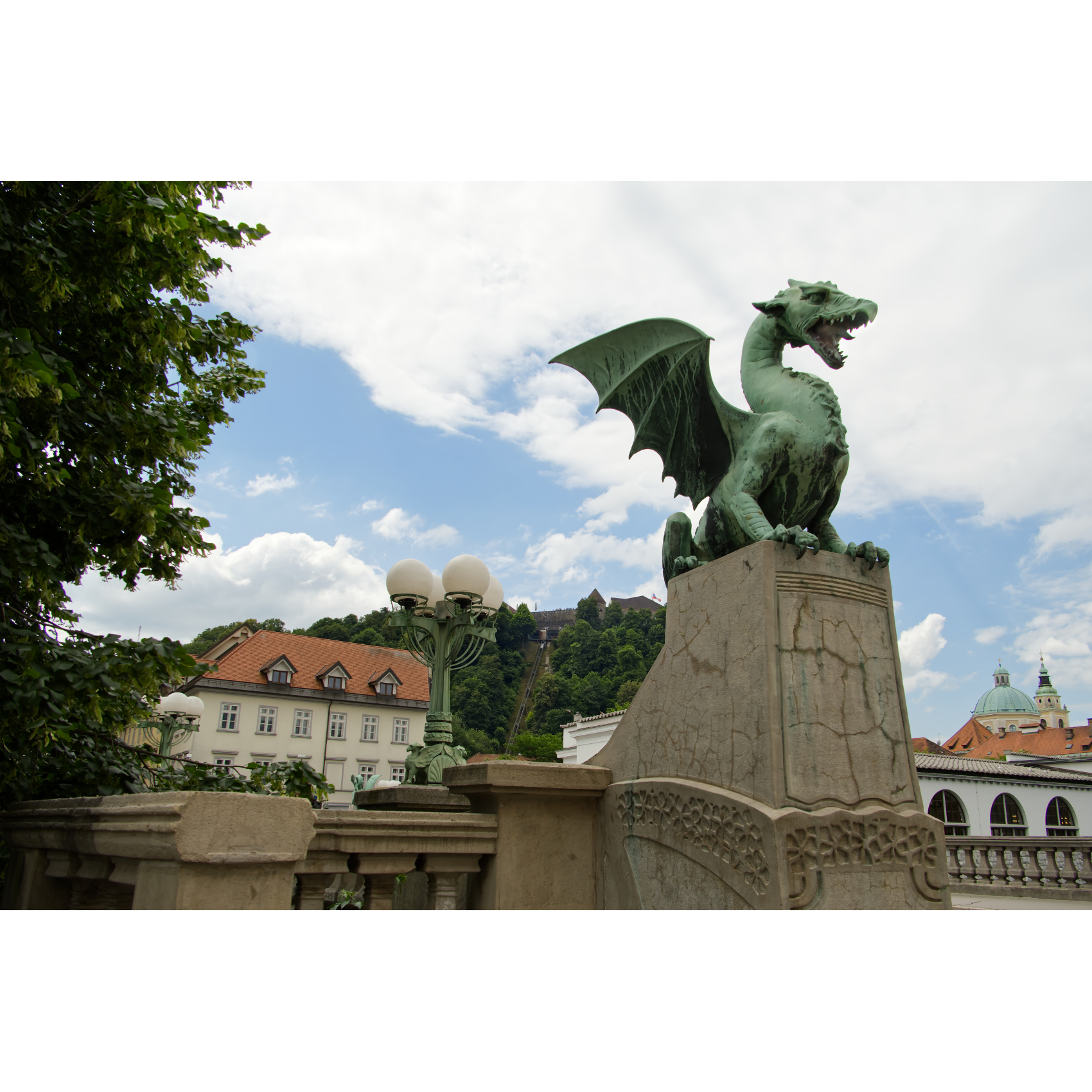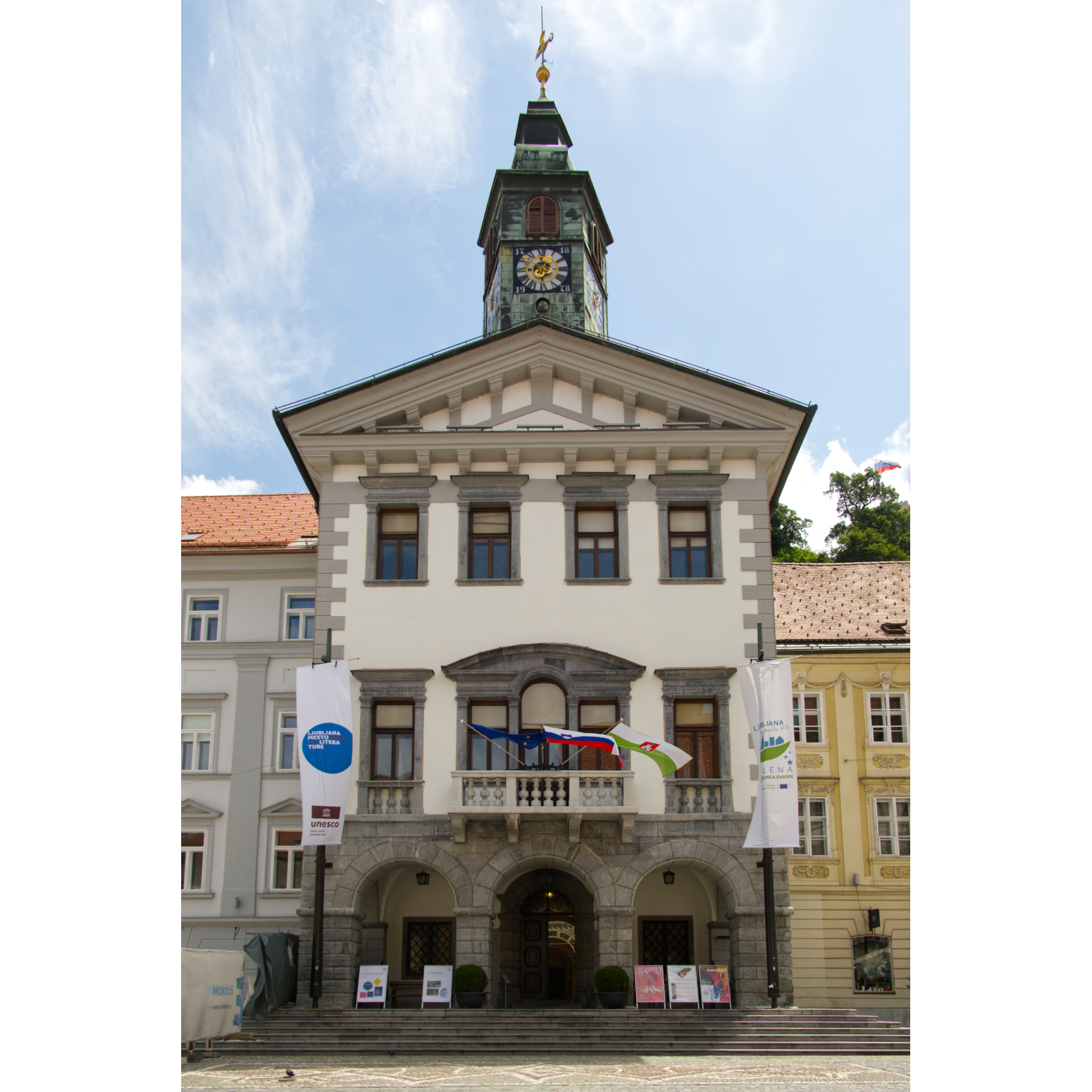Spaziergang in der schön restaurierten Altstadt von Ljubljana: Am Fluß entlang reiht sich ein Lokal ans andere - Drachenbrücke - zwei charmante Damen verkaufen selbst geklöppelten Schmuck - Kirche Mariä Verkündigung - eine italienische Kinder-Radlgruppe - interessantes Haus - Rathaus mit Innenhof - Trinkwasserbrunnen - auf der Burg
