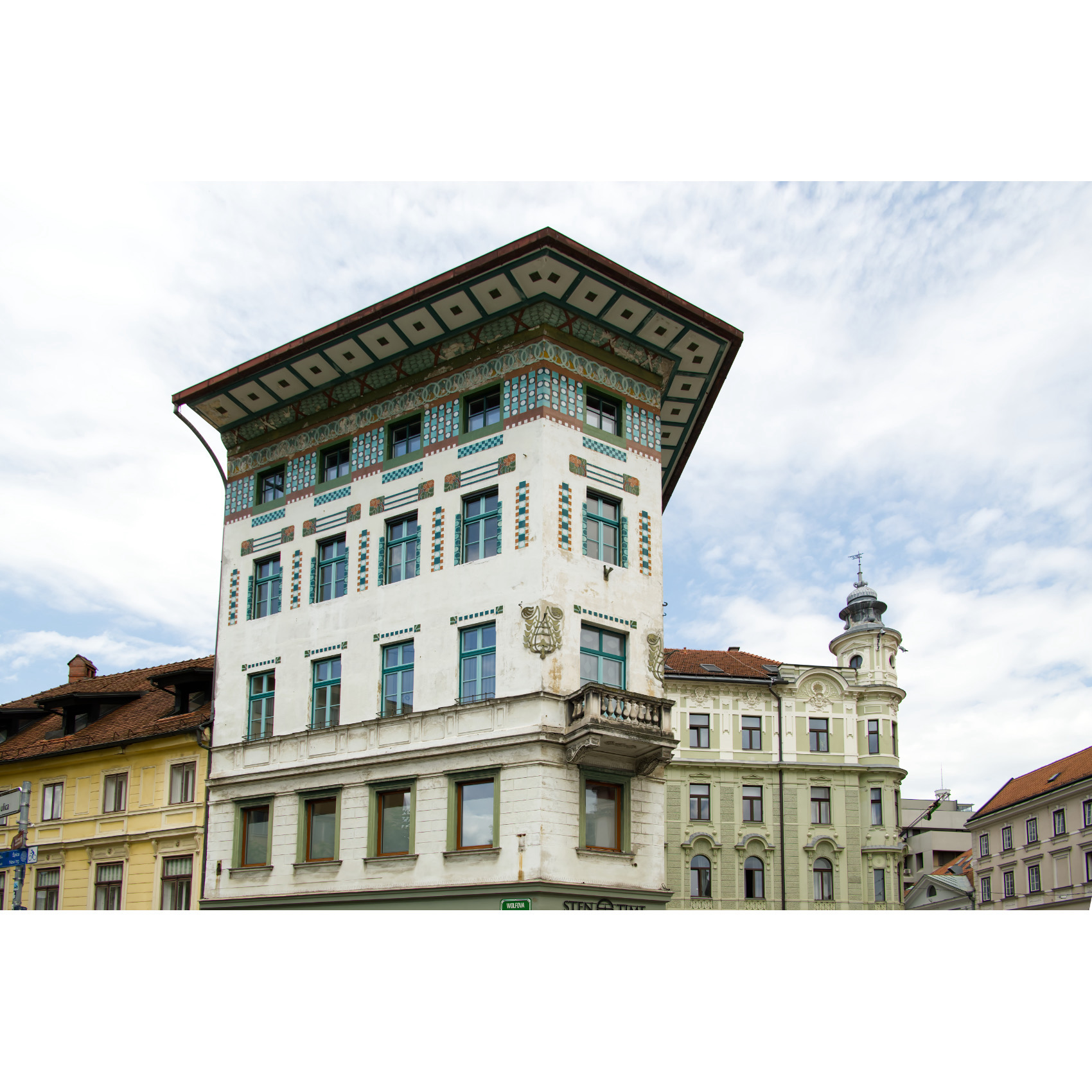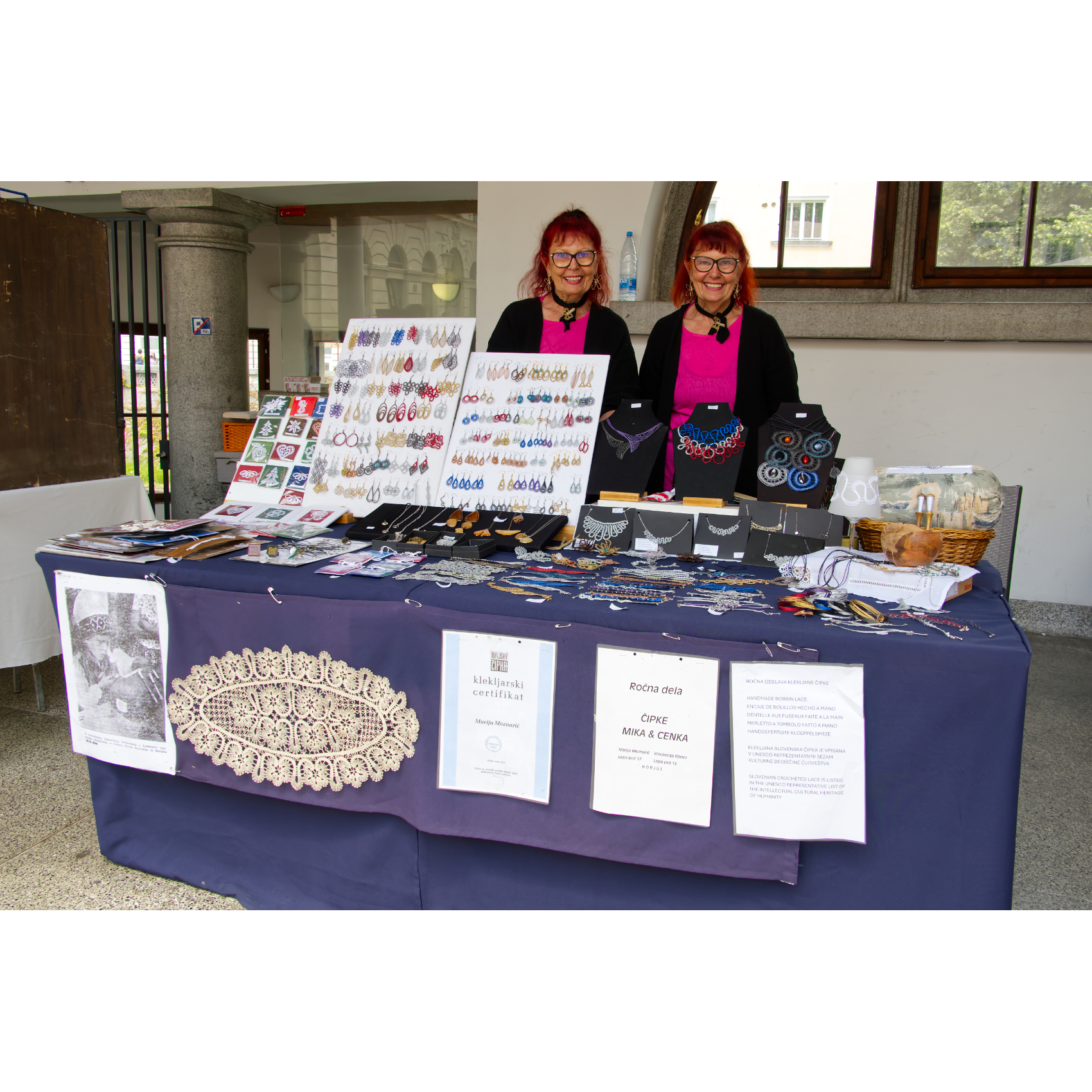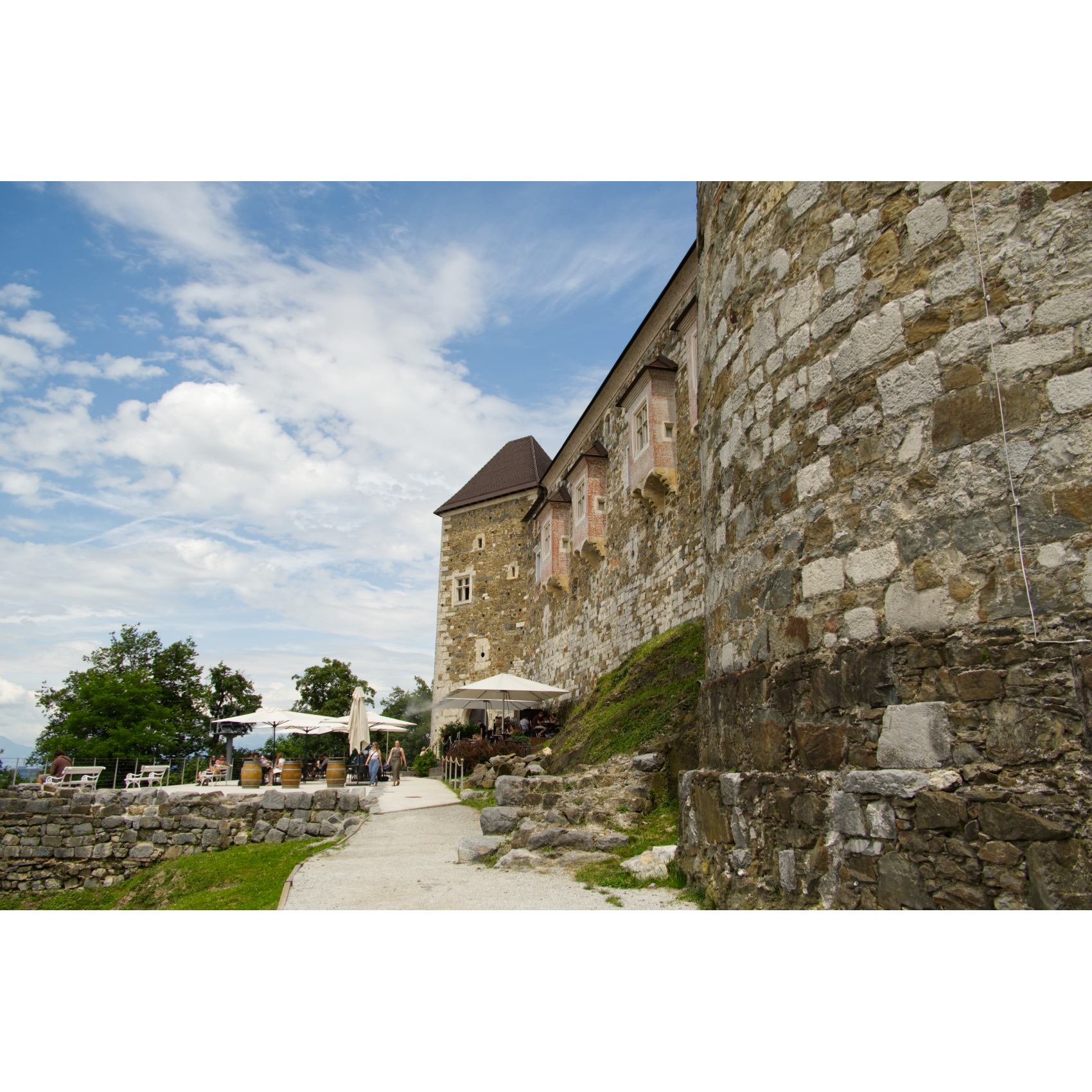 Spaziergang in der schön restaurierten Altstadt von Ljubljana: Am Fluß entlang reiht sich ein Lokal ans andere - Drachenbrücke - zwei charmante Damen verkaufen selbst geklöppelten Schmuck - Kirche Mariä Verkündigung - eine italienische Kinder-Radlgruppe - interessantes Haus - Rathaus mit Innenhof - Trinkwasserbrunnen - auf der Burg