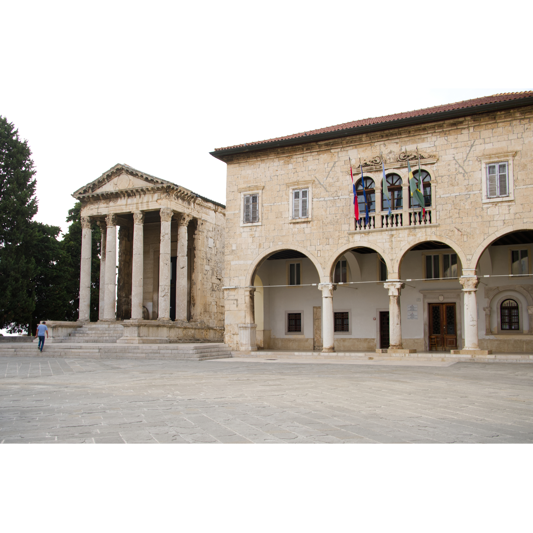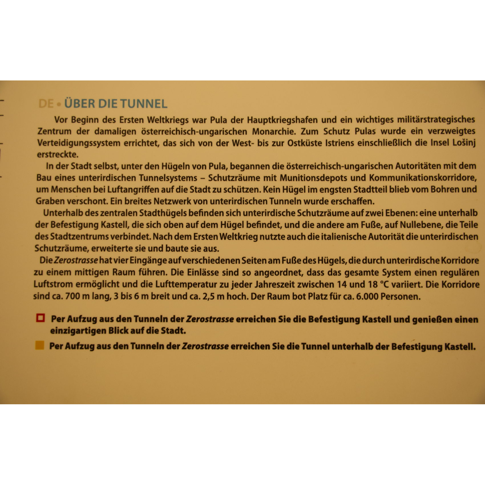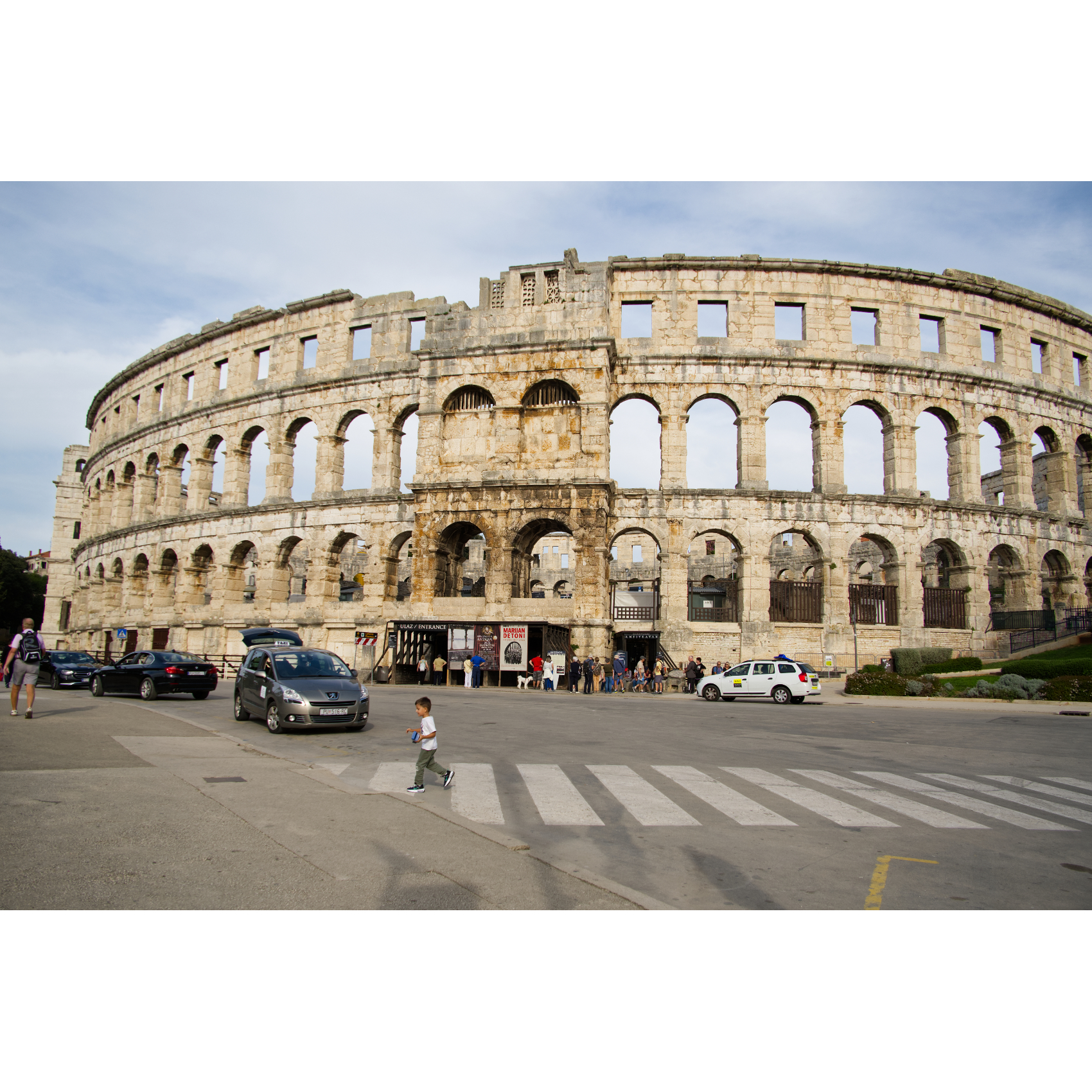 Auch in Pula müssen die Wohnmobile draußen bleiben. Ist aber nicht schlimm, vom großen Parkplatz Mandrač bis in die Altstadt ist es nicht weit. (Kostet € 13,30 für 24h, Übernachten wird toleriert, halt ohne Campingverhalten.) Das Amphitheater ist wohl das bekannteste Bauwerk der Stadt. Gebaut im 1.Jh n. Chr. ist es heute noch beeindruckend, es ist das sechstgrößte der Antike und eines der am besten erhaltenen. - Das Doppeltor führt zur Zerostraße, einem historischen unterirdischen Tunnelnetz. Eine Ausstellung zeigt die Entwicklung des Verkehrs von der Tram zum Automobil. - Das römische Mosaik ist vermutlich aus dem 3.Jh. - Forumsplatz mit Augustustempel und Rathaus - Die leuchtenden Giganten zeigen sich jeden Abend in verschiedenen Farben.