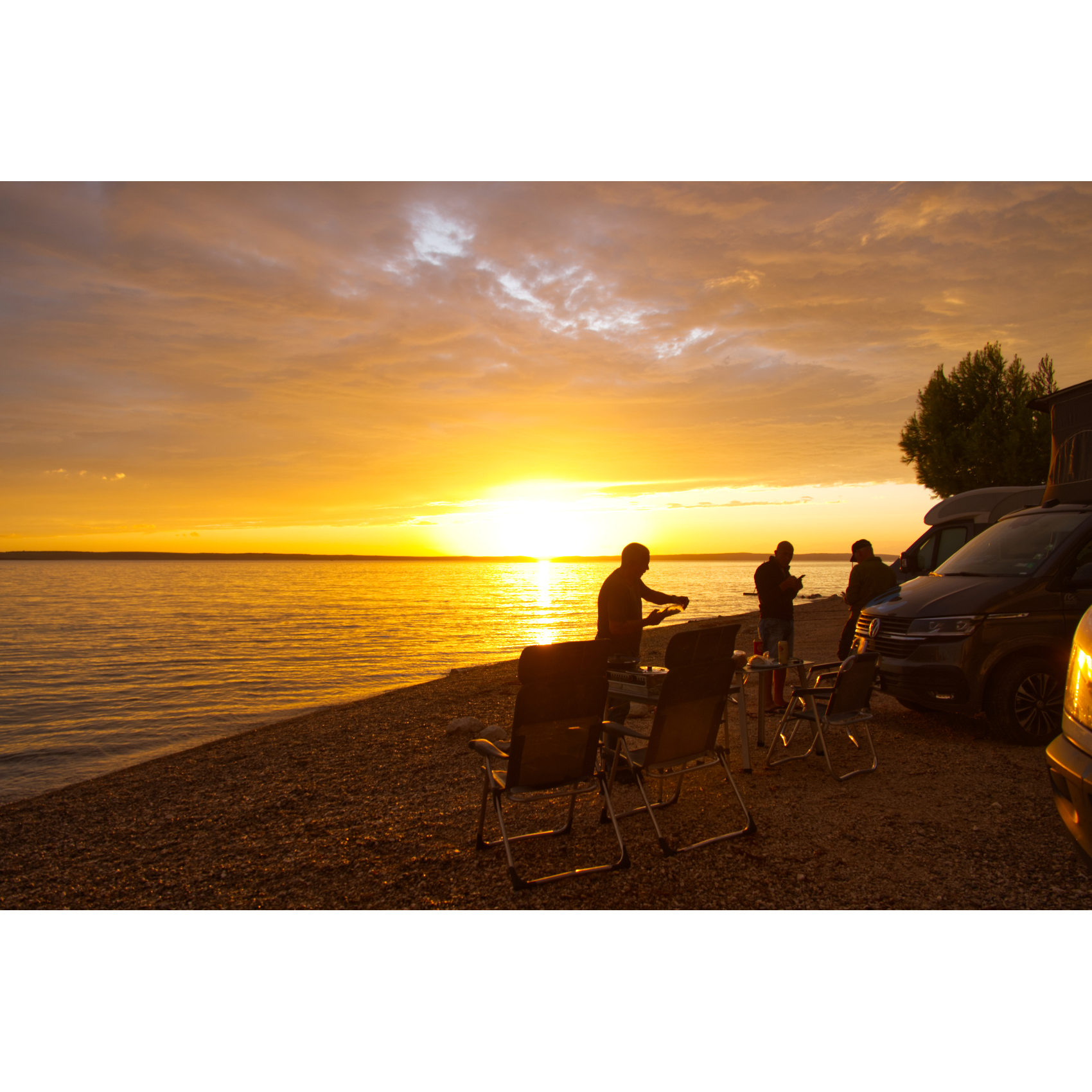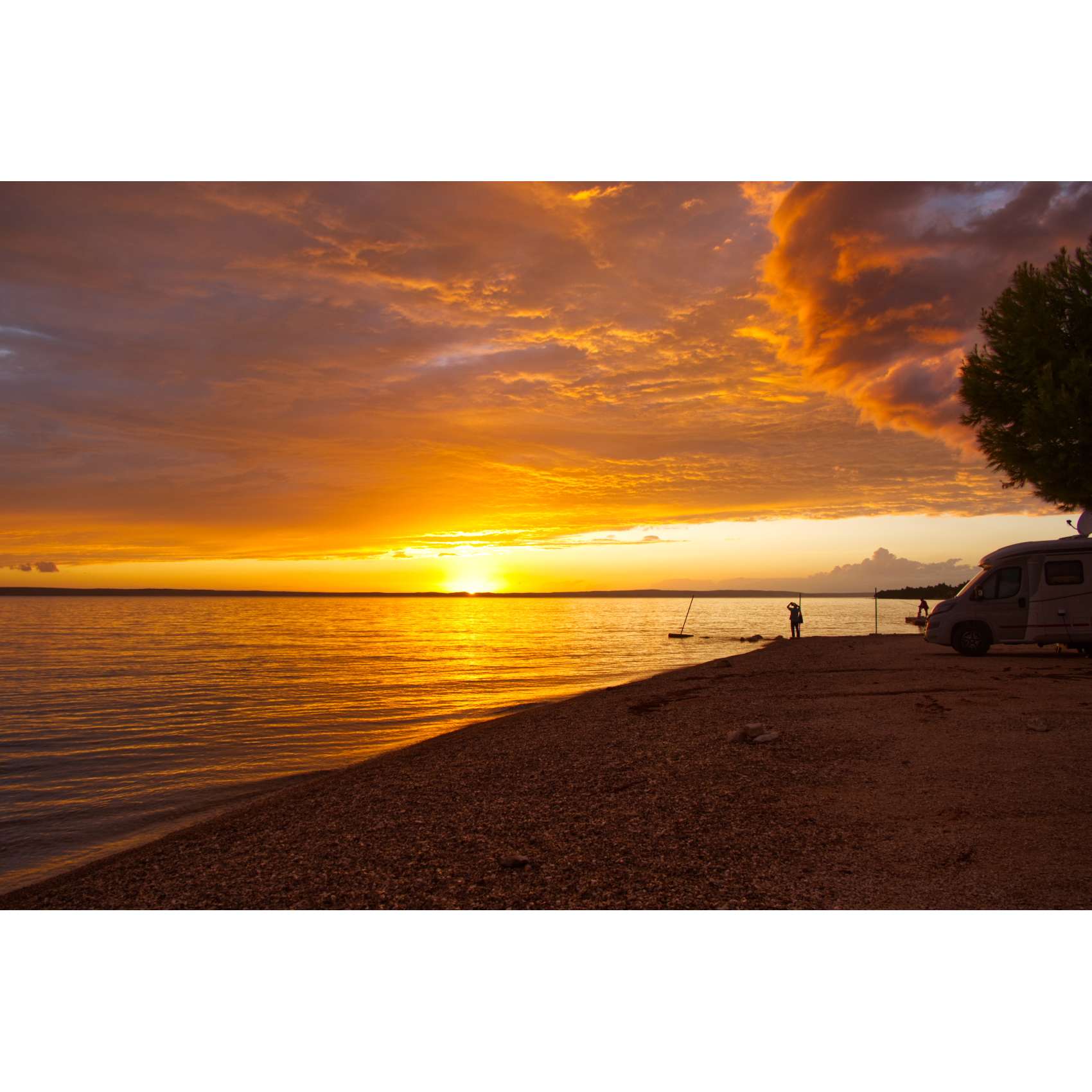 Nach unserem Streifzug durch Zadar ein Abstecher zum Winnetou-Plateau oberhalb der Zrmanja-Schlucht. Hier wurden Szenen mehrerer Winnetou-Filme gedreht. Auf Grund der heftigen Regenfälle der letzten Tage war das Wasser des Flusses leider nicht azurblau sondern erdbraun - die Schlucht ist trotzdem schön! Zurück am Stellplatz, wo wir direkt am Wasser stehen konnten, der krönende Abschluss des Tages: Fischessen am Strand bei grandiosem Sonnenuntergang …